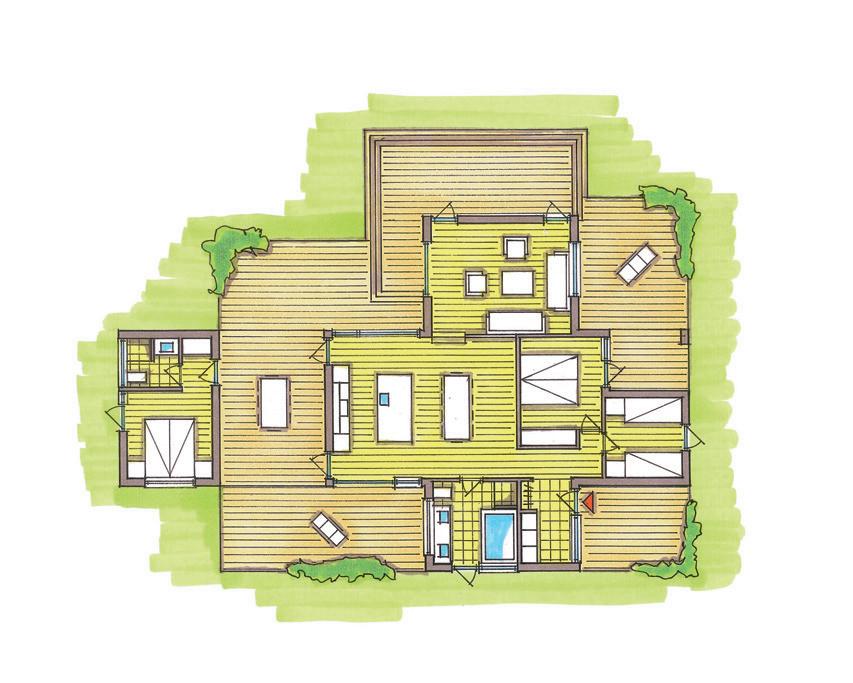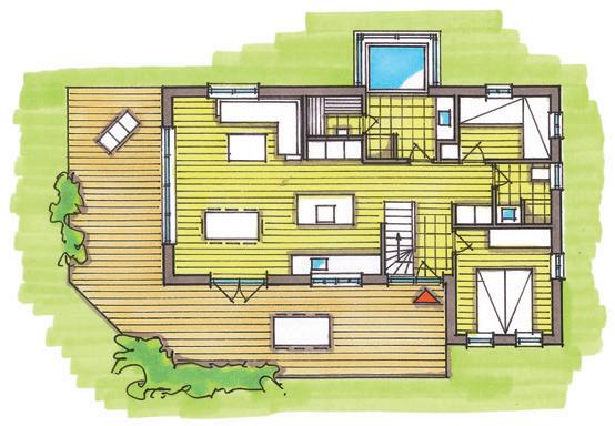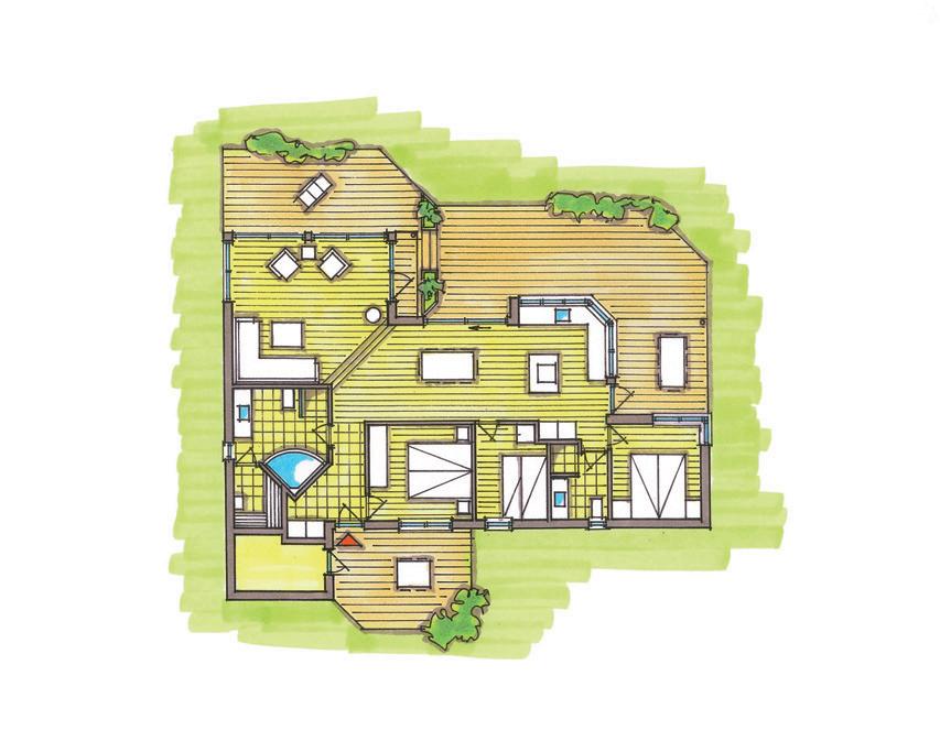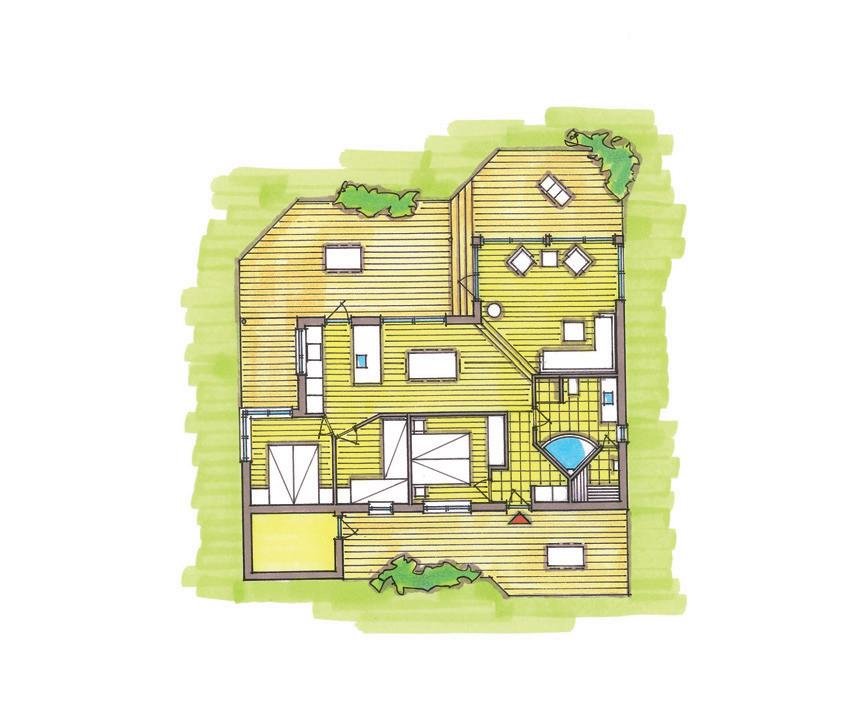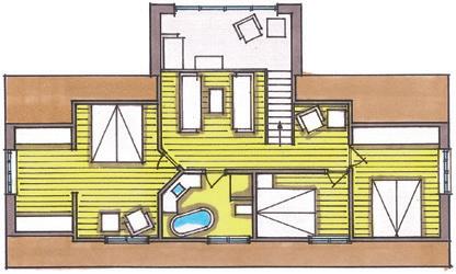 indmuret spa bygget ud i facaden med glasparti hele vejen rundt, gæstetoilet og entré med trappe til 1. sal. 1. sal indeholder stort soveværelse med 4 senge og en lille stue, hvor man har kig til spiseplads og stue i underetagen.