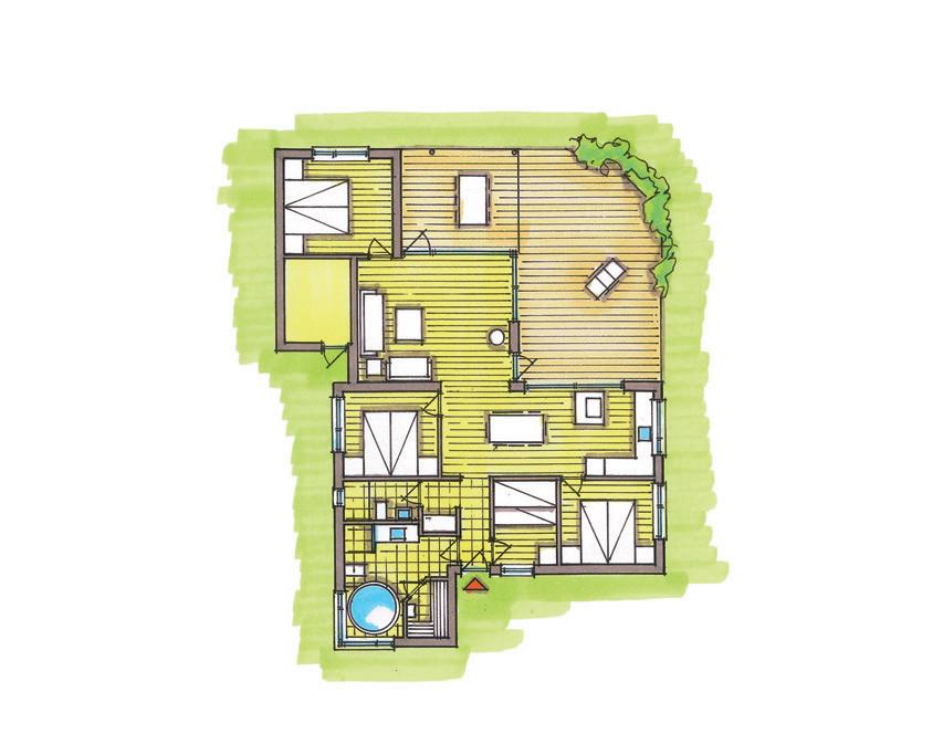 badeafdeling i form af stort og lækkert bad med sauna, bruseniche, bordarrangement med dobbeltvask og udgang til udendørs spabad på terrassen. Spabadet er placeret på terrassen direkte udenfor wellness-/badeafdelingen under den overdækkede terrasse. Fra de store glaspartier i soveværelse og bad har man udsyn til det udvendige spabad. En meget spændende detalje.