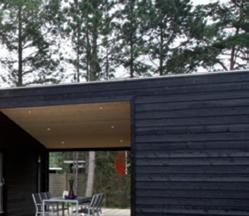 Utraditionel og spændende arkitektur med de store glasfacader og forskydninger i konstruktionen. Et virkeligt skønt fritidshus med alt hvad man kan ønske sig. Huset indeholder 2 store soveværelser med indbyggede skabe, hvoraf det ene har eget bad, samt 2 værelser med 2 køjesenge i hver. I øvrigt skønt køkken med fritstående køkkenø, spiseplads og trappe til den hævede stue med de store glaspartier og skydedør til terrassen. Huset har wellness-/