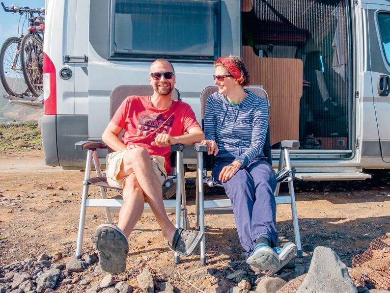 und schmunzelt, „und dann vergingen die Jahre ...! Von sel ber wird nämlich nichts konkret.“ Auf einem Reisevortrag, den sie besucht, bekommt sie schließlich den Rat: „Setz dir ein Datum!“ Damit sei ein Plan konkret und man könne die nötigen Schritte einleiten. Und das taten die beiden dann auch! Markus‘ Arbeitgeber SONNENTOR machte die einjährige Jobpause möglich, das Haus, in dem die beiden im österreichischen Waldviertel lebten, wurde vermietet und das Auto verkauft. Als Karin und Markus den Freund:innen und Verwandten von ihrem Plan berichteten, seien die zunächst erstaunt gewesen. Karin erinnert sich: „Gemeinsam mit Markus‘ Eltern fuhren wir auf eine Messe für Wohnmobile. Erst auf dem Weg dorthin haben wir ihnen gesagt, dass wir ein Jahr lang wegfahren, und da waren sie erst mal völlig sprachlos. Aber dann haben sich alle für uns gefreut.“