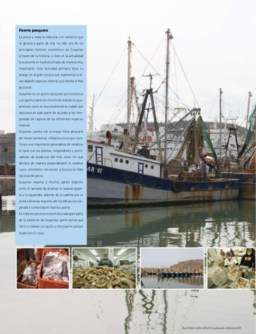 Puerto pesquero La pesca y toda la industria y el comercio que se genera a partir de ella, ha sido uno de los principales motores económicos de Guaymas a través de la historia; si bien en la actualidad la economía se ha diversificado de manera muy importante, esta actividad primaria basa su arraigo en la gran riqueza que representa la diversidad de especies marinas que brinda el Mar de Cortés. Guaymas es un puerto pesquero por excelencia y se aprecia tanto en el estilo de vida de los guaymenses como en la economía de la ciudad, que reacciona en gran parte de acuerdo a las temporadas de captura de las diferentes especies marinas. Guaymas cuenta con la mayor flota pesquera del litoral sonorense, infraestructura que constituye una importante generadora de empleos al igual que las plantas congeladoras y procesadoras de productos del mar, entre los que destaca de manera preponderante la sardina, cuyos volúmenes convierten a Sonora en líder nacional de pesca. Guaymas exporta a muchos países especies como el camarón de altamar, el calamar gigante y la aguamala, además de la sardina que se envía a diversas regiones del mundo ya sea congelada o convertida en harina y aceite. En todo ese proceso está involucrada gran parte de la población de Guaymas; gente activa que hace su trabajo con gusto y entusiasmo porque la pesca es lo suyo.
