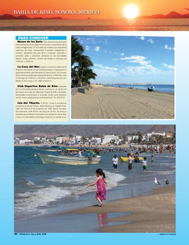 La Casa del Mar. Espacio cultural formado por el Gobierno del Estado, la comunidad europea y organismos no gubernamentales, para fomentar el conocimiento y la conservación de los ecosistemas costeros de Sonora. Horario de Lunes a Domingo de 10:00 am. a 16:00 hrs. Calle Esqueda esq. con Bilbao en Kino Nuevo. Tel.: (662) 242 02 21 Club Deportivo Bahía de Kino Integrado por la comunidad estadounidense, cuenta con un campo de golf anexo en el que se organizan torneos de golf y de pesca, actividades encaminadas a recaudar fondos para beneficio social. Incluye resguardo de embarcaciones. Tel. 242 03 21. Isla del Tiburón. A 28 Km., frente a la bahía se encuentra la Isla del Tiburón, descubierta por el Capitán Francisco de Ulloa el 24 de Diciembre de 1539. Siendo la mayor isla mexicana, mide 50 Km. de largo por 25 Km. de ancho y actualmente es Reserva Ecológica para protección de su flora y fauna. En ella habitan el borrego cimarrón y el venado bura.