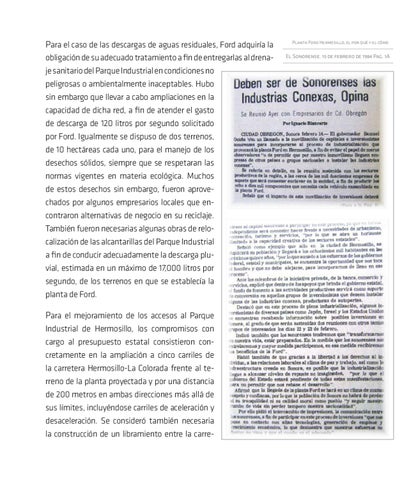 obligación de su adecuado tratamiento a fin de entregarlas al drenaje sanitario del Parque Industrial en condiciones no peligrosas o ambientalmente inaceptables. Hubo sin embargo que llevar a cabo ampliaciones en la capacidad de dicha red, a fin de atender el gasto de descarga de 120 litros por segundo solicitado por Ford. Igualmente se dispuso de dos terrenos, de 10 hectáreas cada uno, para el manejo de los desechos sólidos, siempre que se respetaran las normas vigentes en materia ecológica. Muchos de estos desechos sin embargo, fueron aprovechados por algunos empresarios locales que encontraron alternativas de negocio en su reciclaje. También fueron necesarias algunas obras de relocalización de las alcantarillas del Parque Industrial a fin de conducir adecuadamente la descarga pluvial, estimada en un máximo de 17,000 litros por segundo, de los terrenos en que se establecía la planta de Ford.
