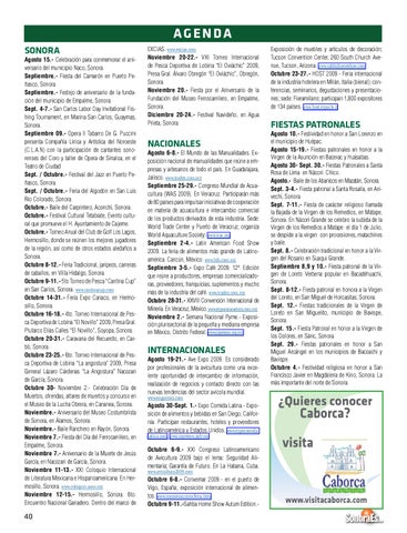 EXCIAS. www.excias.com Noviembre 20-22.- VXI Torneo Internacional de Pesca Deportiva de Lobina “El Oviáchic” 2009, Presa Gral. Álvaro Obregón “El Oviáchic”, Obregón, Sonora. Noviembre 20.- Fiesta por el Aniversario de la Fundación del Museo Ferrocarrilero, en Empalme, Sonora. Diciembre 20-24.- Festival Navideño, en Agua Prieta, Sonora.