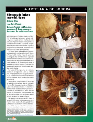 Artesanía Ritual Etnia Mayo (Yoreme) Ubicación: Valle del río Mayo, en la comunidad de El Júpare, municipio de Huatabampo. Sur del Estado de Sonora La localidad mayo de El Júpare, situada en el Municipio de Huatabampo, mantiene con fuerza su tradición yoreme, en parte debido al impulso del centro de Culturas Populares instalado en este poblado y a la presencia del museo Blas Mazo donde uno puede admirar piezas artesanales totalmente originales y grupos escultóricos que plasman, en pequeños dioramas, fiestas tradicionales de la cultura mayo. En El Júpare, durante las festividades de la Cuaresma, quizás la celebración más importante del pueblo Yoreme, los fariseos también muestran un atuendo especial que los distingue de otras comunidades mayo. Su principal característica reside en la máscara que utilizan. Los fariseos o Pariseron (en lengua yoreme) son hombres de 15 años en adelante, que por manda o promesa utilizan la máscara durante el tiempo cuaresmal. Desde meses van trabajando la forma que tendrá, con piel cruda de cabra, jabalí, venado o borrego. Los fariseos del Júpare presentan dos modelos de máscara: una con largas orejas y nariz que simboliza el ser maligno que dio muerte a lo Sagrado (Jesucristo), por lo que al culminar el ceremonial, el sábado de gloria, la máscara es lanzada al fuego como símbolo de purificación. La otra máscara es una representación de una cara con rasgos femeninos que busca hacer caer en tentación al hombre. Esta máscara, que recuerda las utilizadas en Europa en los carnavales anteriores a la Cuaresma, se introduce a finales de la década de los 70 y se ha ido popularizando con mucha fuerza en los últimos años. Está elaborada con tronco y raíz de álamo incrustada en una piel de cabra, con grandes orejas, simbolizando de igual manera al ser maligno que representa el fariseo. Las máscaras de los fariseos mayo de El Júpare, al igual que las de los fariseos de Masiaca que expusimos en el número anterior de esta revista, forman parte del rico y auténtico acervo cultural-artesanal del Estado de Sonora. Ma. Inmaculada Puente Andrés, es licenciada en Periodismo por la Universidad de Navarra (España) con diplomado en Historia del Arte por la Universidad de Valladolid (España). Actualmente es Directora de Lutisuc Asociación Cultural I.A.P., organización no gubernamental dedicada al rescate, preservación y difusión de la cultura indígena de Sonora, ubicada en Calle Ignacio Comonfort No. 50 , local E, en la planta alta. Colonia Centenario, en la nueva Plaza Bicentenario, en Hermosillo, Sonora. Fotografía: Enrique Yescas E.