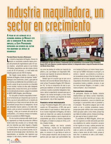 Fomenta inter-proveeduría La Expo Proveeduría Nogales 2012 contó en esta ocasión con 120 expositores, el 50% más que el evento anterior lo que muestra el interés que existe en el sector maquilador de Nogales y de toda la región por desarrollar una cadena de proveeduría local; la iniciativa obedece a que la mayoría de los componentes que utiliza la industria maquiladora de Nogales y el Estado se compra en China, La India o Estados Unidos. “Queremos cambiar esa inercia -comenta Jesús Montoya-; muchas de las maquiladoras instaladas en Sonora, especialmente las de Nogales, no conocen ni lo que fabrica el vecino en el mismo parque industrial; esta (la expo) es una apertura para que sepan qué oportunidades hay