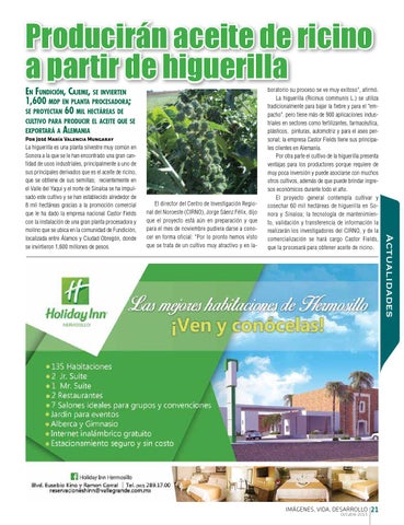 boratorio su proceso se ve muy exitoso", afirmó. La higuerilla (Ricinus communis L.) se utiliza tradicionalmente para bajar la fiebre y para el "empacho". pero tiene más de 900 aplicaciones industriales en sectores como fertilizantes, farmacéutica, plásticos, pinturas, automotriz y para el aseo personal; la empresa Castor Fields tiene sus principales clientes en Alemania. Por otra parte el cultivo de la higuerilla presenta ventajas para los productores porque requiere de muy poca inversión y puede asociarse con muchos otros cultivos, además de que puede brindar ingresos económicos durante todo el año. El proyecto general contempla cultivar y cosechar 60 mil hectáreas de higuerilla en Sonora y Sinaloa; la tecnología de mantenimiento, validación y transferencia de información la realizarán los investigadores del CIRNO, y de la comercialización se hará cargo Castor Fields, que la procesará para obtener aceite de ricino.