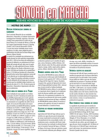 Crece área de siembra en el Yaqui Hacia mediados de mayo pasado ya se habían autorizado 216,348.51 hectáreas de siembra de las 220,000 programadas para el ciclo agrícola 2017-2018 en el Valle del Yaqui, lo que significa un crecimiento en la superficie de cultivo de esa región. Es la zona de Villa Juárez la de mayor área de siembra con 68,064.88 hectáreas, seguida de Bácum con 56,505.17, Pueblo Yaqui con 51,893.31 y Ciudad Obregón con 39,886.16. Los principales cultivos son el trigo con 110,577.80 hectáreas, el maíz con 41,055.34, el garbanzo con 27,037, la alfalfa con 5,940.84, la papa con 3,652, el nogal con 3,008, el frijol con 2,856.63, y el espárrago y la naranja con 2,319 hectáreas cada uno. También se establecieron 1,693 hectáreas de chile, 1,314 de calabaza, 974.63 de tomate, 690 de sandía, 626 de tomatillo, 571.73 de zacate, 372 de pepino, 305 de lechuga, 279 de toronja y 257 de zanahoria. Aunque con menor superficie, algunos