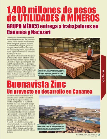 Un proyecto en desarrollo en Cananea Ya lo habían mencionado durante uno de los seminarios mineros recientes, cuando Xavier García de Quevedo expuso el potencial y los proyectos de Grupo México en el Continente. Buenavista Zinc es una nueva planta que explotará en Cananea, propiamente en los espacios de los campos mineros originales de Puertecitos y Potreritos, el yacimiento de zinc que junto con el cobre se encuentra también disponible para su extracción y aprovechamiento a minado de cielo abierto y con proceso de obtención por flotación, es decir en una concentradora con doble diseño donde también se obtendrá en menor cantidad el cobre. De acuerdo a las notas internacionales, el proyecto se ha terminado y ya se inició el proceso de adquisición de equipo que espera estar funcionando en 2020 en Cananea, después de haber realizado una inversión de más de 400 millones de dólares.