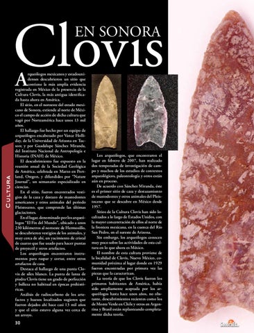 rqueólogos mexicanos y estadounidenses descubrieron un sitio que contiene la más amplia evidencia registrada en México de la presencia de la Cultura Clovis, la más antigua identificada hasta ahora en América. El sitio, en el noroeste del estado mexicano de Sonora, extiende al norte de México el campo de acción de dicha cultura que vagó por Norteamérica hace unos 13 mil años. El hallazgo fue hecho por un equipo de arqueólogos encabezado por Vance Holliday, de la Universidad de Arizona en Tucson; y por Guadalupe Sánchez Miranda, del Instituto Nacional de Antropología e Historia (INAH) de México. El descubrimiento fue expuesto en la reunión anual de la Sociedad Geológica de América, celebrada en Marzo en Portland, Oregon, y difundidos por “Nature Journal”, un semanario especializado en ciencias. En el sitio, fueron encontrados vestigios de la caza y destazo de mastodontes americanos y otros animales del periodo Pleistoceno, que comprende las últimas glaciaciones. En el lugar, denominado por los arqueólogos “El Fin del Mundo”, ubicado a unos 230 kilómetros al noroeste de Hermosillo, se descubrieron vestigios de los animales, y muy cerca de ahí, un yacimiento de cristal de cuarzo que fue usado para hacer puntas de proyectil y otros artefactos. Los arqueólogos encontraron instrumentos para raspar y cortar, entre otros artefactos de caza. Destaca el hallazgo de una punta Clovis de sílex blanco. La punta de lanza de piedra Clovis tiene un grado de perfección y belleza no habitual en épocas prehistóricas. Análisis de radiocarbono de los artefactos y huesos localizados sugieren que fueron dejados ahí hace casi 13 mil años y que el sitio estuvo alguna vez cerca de un arroyo.