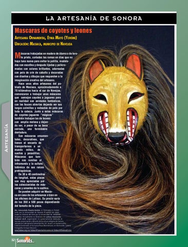 áscaras trabajadas en madera de álamo o de torote prieto, cortadas las ramas en días que no haya luna nueva para evitar la polilla, modeladas con escofina y después lijadas y policromadas con colores brillantes, adornadas con pelo de crin de caballo y decoradas con diseños y dibujos que responden a la imaginación creativa del artesano. Hace unos años artesanos del poblado de Masiaca, aproximadamente a 70 kilómetros hacia el sur de Navojoa, comenzaron a trabajar unas máscaras que semejan coyotes o jaguares pero en realidad son animales fantásticos, con las fauces abiertas dejando ver sus largos colmillos y rodeados de pelo por toda la cabeza. Junto a estas máscaras de coyotes-jaguares “mágicos” también trabajan las de leones con amplia melena y dejando ver, a pesar de su boca cerrada, una formidable dentadura. Son máscaras ornamentales, decorativas, que tienen el encanto de transportarnos a un mundo mítico, de sueños y pesadillas. Máscaras que también nos remiten al inframundo y la cultura totémica de sus raíces prehispánicas. De 30 a 40 centímetros de longitud, estas piezas son muy apreciadas por los coleccionistas de máscaras y amantes de lo exótico. Se pueden adquirir en Masiaca en casa de los artesanos o bien en las oficinas de Lutisuc. Su precio varía de los 350 a 500 pesos dependiendo del tamaño de la pieza.