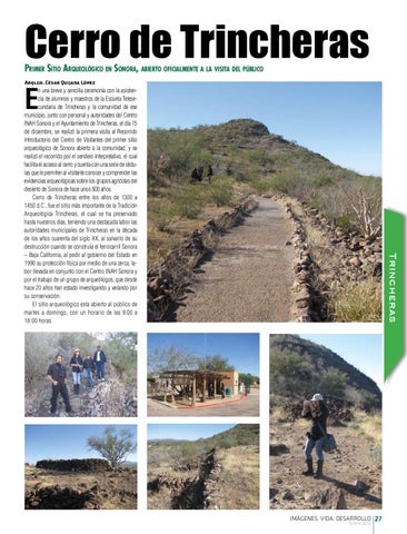 n una breve y sencilla ceremonia con la asistencia de alumnos y maestros de la Escuela Telesecundaria de Trincheras y la comunidad de ese municipio, junto con personal y autoridades del Centro INAH Sonora y el Ayuntamiento de Trincheras, el día 15 de diciembre, se realizó la primera visita al Recorrido Introductorio del Centro de Visitantes del primer sitio arqueológico de Sonora abierto a la comunidad, y se realizó el recorrido por el sendero interpretativo, el cual facilita el acceso al cerro y cuenta con una serie de cédulas que le permiten al visitante conocer y comprender las evidencias arqueológicas sobre los grupos agrícolas del desierto de Sonora de hace unos 600 años. Cerro de Trincheras entre los años de 1300 a 1450 d.C., fue el sitio más importante de la Tradición Arqueológica Trincheras, el cual se ha preservado hasta nuestros días, teniendo una destacada labor las autoridades municipales de Trincheras en la década de los años cuarenta del siglo XX, al salvarlo de su destrucción cuando se construía el ferrocarril Sonora – Baja California, al pedir al gobierno del Estado en 1990 su protección física por medio de una cerca, labor llevada en conjunto con el Centro INAH Sonora y por el trabajo de un grupo de arqueólogos, que desde hace 20 años han estado investigando y velando por su conservación. El sitio arqueológico esta abierto al público de martes a domingo, con un horario de las 9:00 a 18:00 horas.