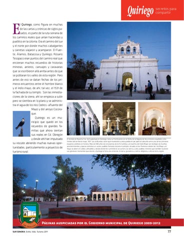 l Quiriego, como figura en muchas de las cartas y crónicas de siglos pasados, es parte de la ruta serrana de los caminos reales que unían haciendas y pueblos en la colonia. Era el camino del sur y el norte por donde muchos cabalgantes y carretas viajaron y acamparon. El Fuerte, Álamos, Batacosa y Quiriego; Rosario Tesopaco eran puntos del camino real que encierran muchos recuerdos de historias mineras, arrieros, carruajes y caravanas que se escribieron allá arriba antes de que se poblaran los valles de esta región. Pero antes de eso se datan fechas de los primeros encuentros entre el hombre blanco y el indio mayo, de ahí, tal vez, el 1531 de la fachada de su templo. Son las inmediaciones de la sierra, ahí se empieza a subir pero se siembra en lo plano y se administra el agua de los ríos Cedros -afluente del Mayo y del arroyo Cocoraque. Quiriego es un municipio que quedó en los recuerdos de grandes familias que ahora sientan sus reales en Cd. Obregón y desde ahí han impulsado su rescate abriendo muchas nuevas oportunidades, particularmente a proyectos de turismo rural.
