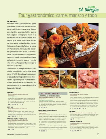 Tour gastronómico: carne, marisco y todo Lo original El comensal de la gastronomía de Cajeme puede seleccionar carne o marisco como es ya tradición en esta parte de Sonora, pero también algunos platillos que se han adoptado como propios hacen de la cocina local una de las más variadas de la región. Igual puede disfrutar de un taco de carne asada en Las Parrillas, que un Parrillada que se sirve en “R2” y en el Bucanero.