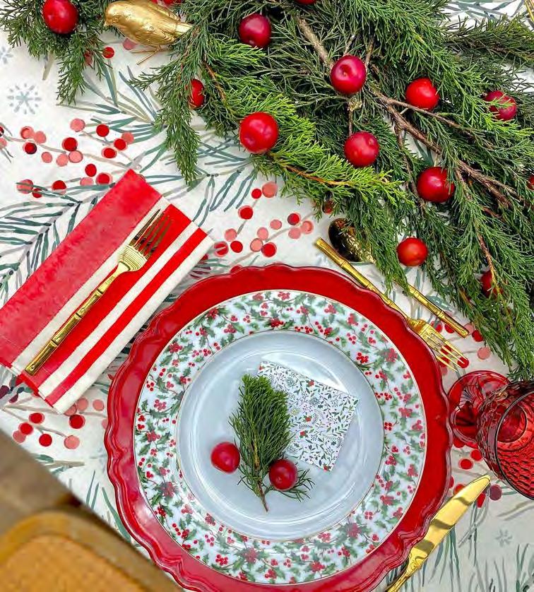 Mantel en lona poliéster antifluido, esquinaconborlas. Centro de mesa hecho a mano con piñasdepinoyhollys. Servilletasrojasderayas CopasdevidrioestiloBarroco Cubiertosdoradosenaceroinoxidable Baseplatocolorrojo Vajillaconmotivonavideño