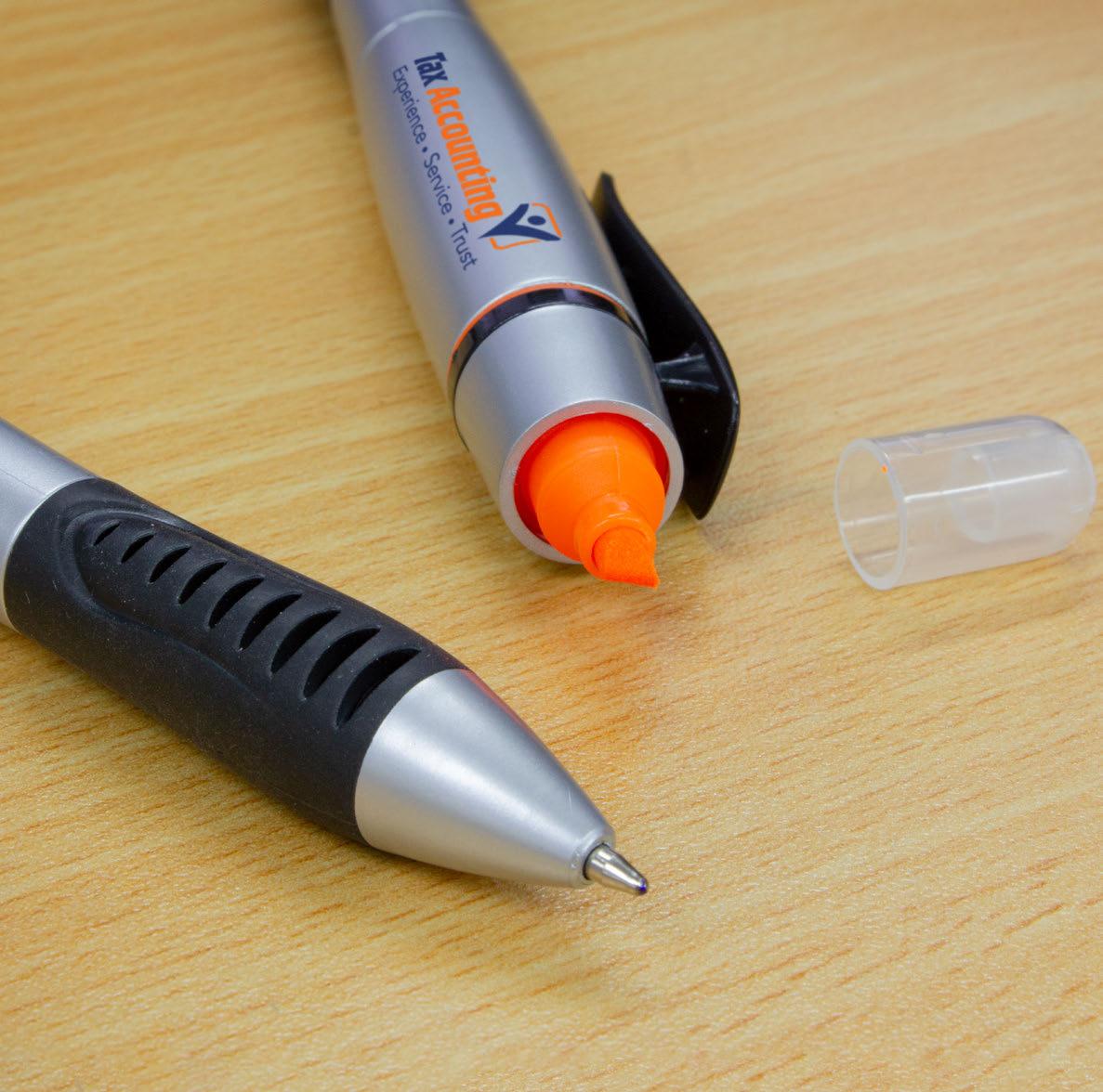 Set of five different coloured highlighters in a stylish plastic case which has a very large branding area. The spring-loaded clip holds the highlighters securely and when flipped open it doubles as a handy desk stand.