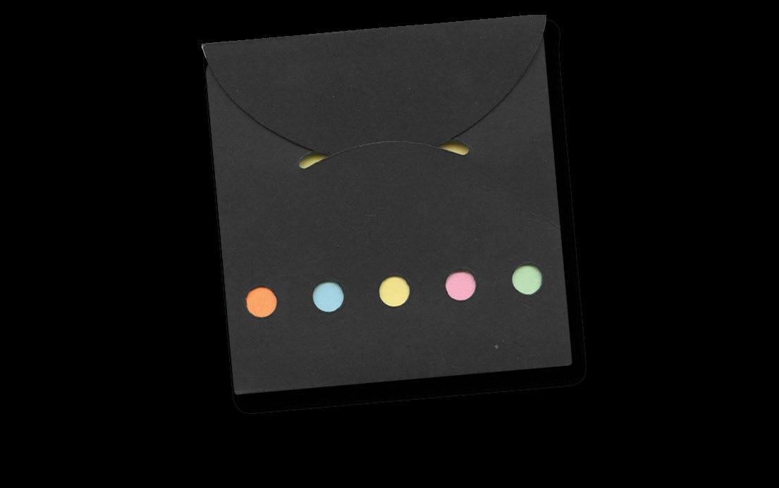 Compact notebook with a hard cover which has a pad of 50 adhesive notes and five different coloured pads of adhesive flags.