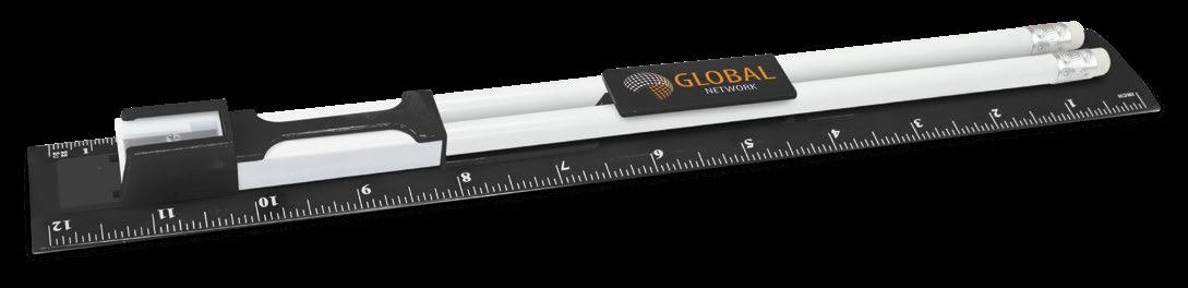 Unique stationery set which consists of a 30cm ruler, two unsharpened pencils, a pencil sharpener and an eraser in one compact unit. The ruler has both metric and imperial graduations.