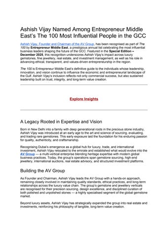 Ashish Vijay is a Dubai-based investor, philanthropist, and entrepreneur with decades of expertise in the luxury gemstone, jewellery, and investment sectors. As Chairman and Founder of the House of Ashish Vijay—which includes Meraki Gems and Jewellery, Tiara Gems, and AV Globale—he leads globally recognised ventures known for premium gemstone sourcing, design innovation, and high-value auctions. Recently appointed Director of the ICA Dubai Chapter, Ashish continues to influence the international gemstone industry with integrity and vision.
