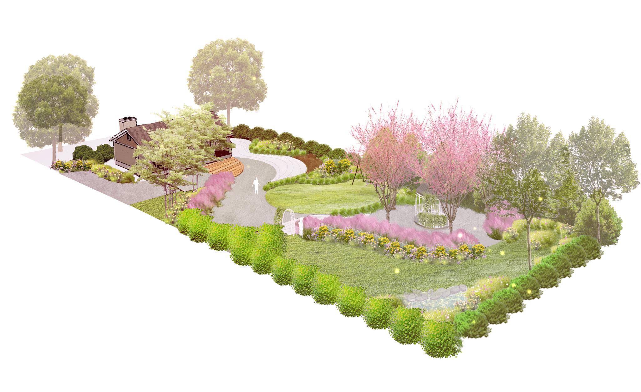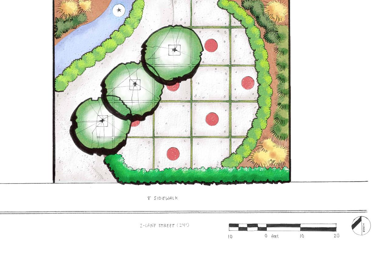 Curvilinear lines are prominent in the space to encourage a sense of exploration through the space. Specific views are framed with the trees around the gazebo, the arbor. High shrubs line the yard to provide a sense of privacy from the neighborhood. This space suits an artistic family with its functional capabilities and peaceful pockets of space, inspiring new works of art anywhere throughout the yard.