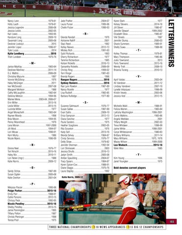 Michelle Wald..............................................1988-91 Felicia Warren..............................................1983-84 LaKisha Washington................................1998-2001 Carrie Watkins.............................................1983-86 Angela Wedlake................................................ 2001 Tiffany Weight..............................................2002-03 Treva Whitaker.............................................1998-99 Jaime White.............................................1998-2001 Carye Whitescarver......................................1980-83 Brittany Williams..........................................2011-14 Mary Williams......................................... 1975, 1978 Macey Wilson..........................................1999-2000 Lea Wodach.............................. 2015-16 Nikki Woo......................................................... 1985