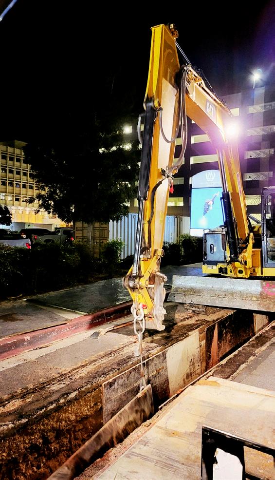 The project featured demolition, trenching for underground ducts and raceways for electrical systems, trenching and backfilling, aggregate base, asphalt concrete pavement, curbs and gutters, and concrete manholes, vaults, and chambers. The scope also included over 2,000 linear feet of mediumvoltage electrical duct bank, complete with two critical tie-ins, and 8,000 square feet of asphalt paving.