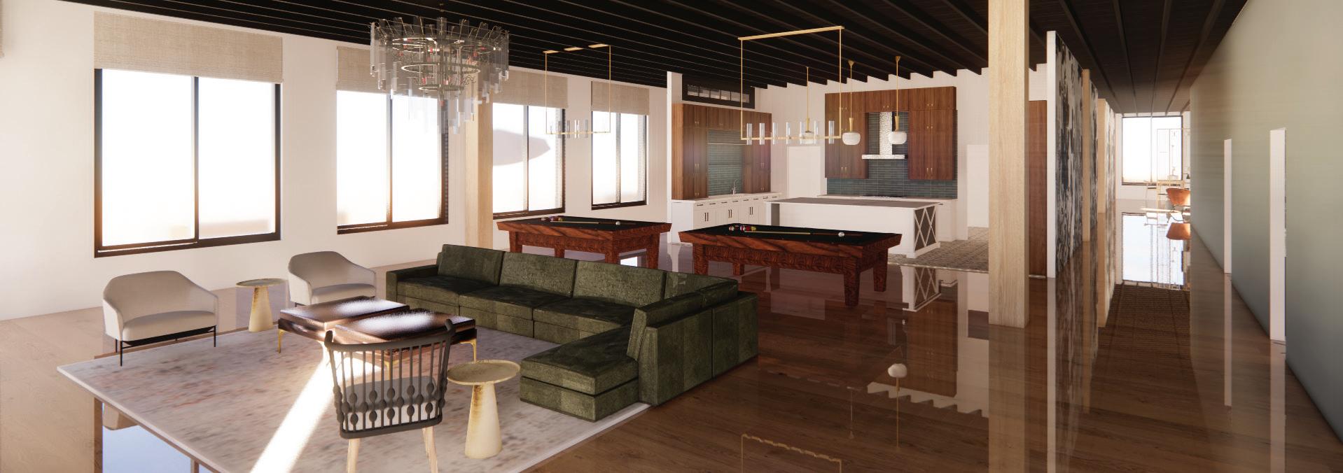 Targeted at students and young professionals in the market area as residents for the community. The palette of materials and furnishings is meant display a sense of comfort and diversity for a private space. Utilizing natural light as a tool throughout the design being carried through in transoms and sidelight windows above doors and the tall walls off the apartment.