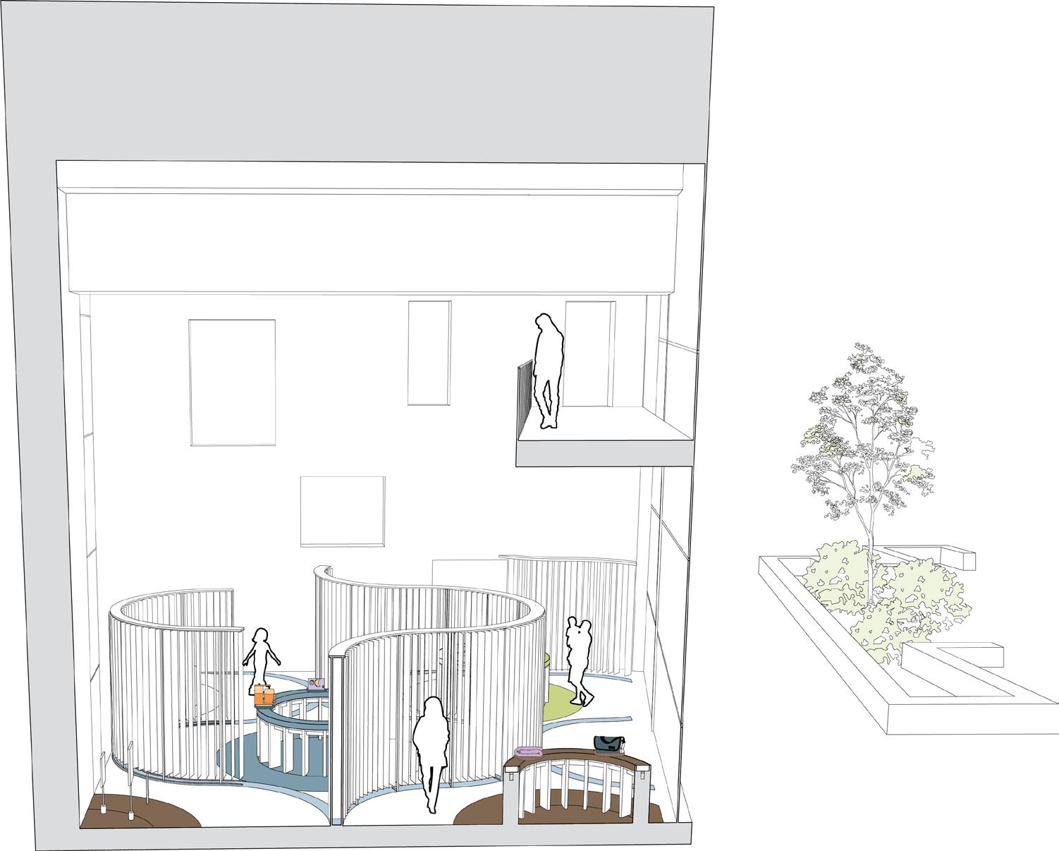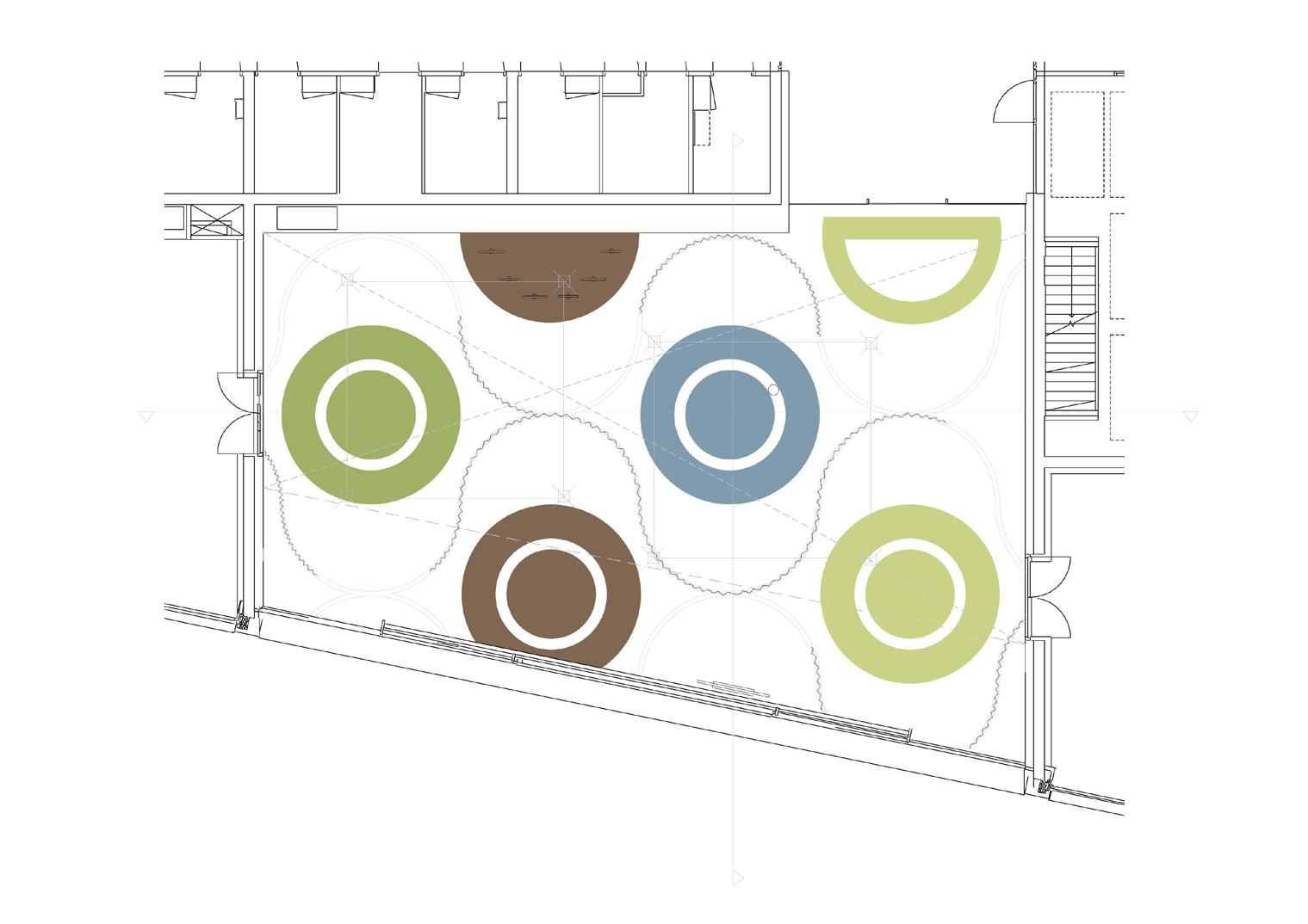 My approach to the Cincinnati Children’s Hospital Cafeteria is to create a space where people can socialize and come together. This is accomplished by the long free-flowing table which is full of activity and opportunity to engage with one another. The social space is punctured by pockets of refuge.