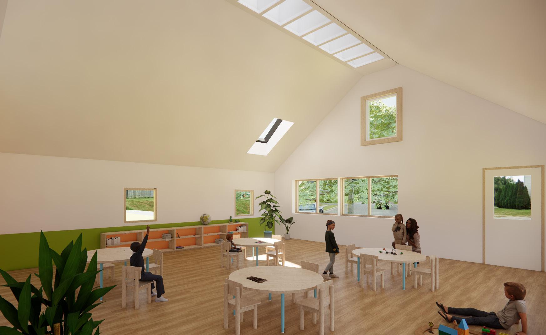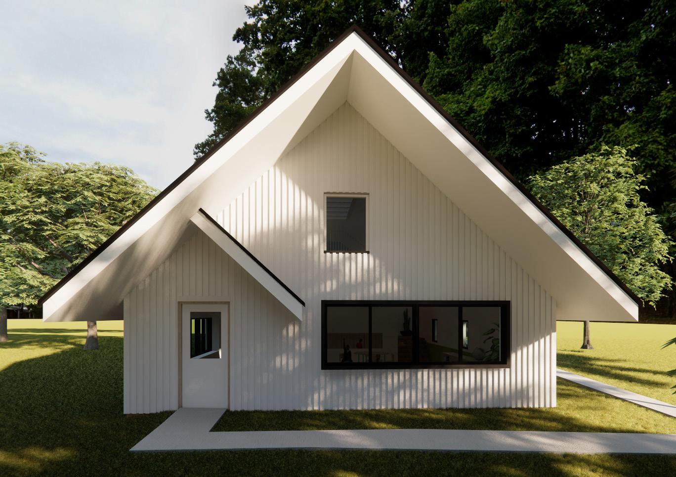 The main goal with the form of this space was to make it feel like “home.” The classic pitched roof styled home really drove this design. It was important to include as many windows and visibilty as possible because the connection to nature is another huge driver of this design. The site is located in the main park in this town where kids tend to congregate.