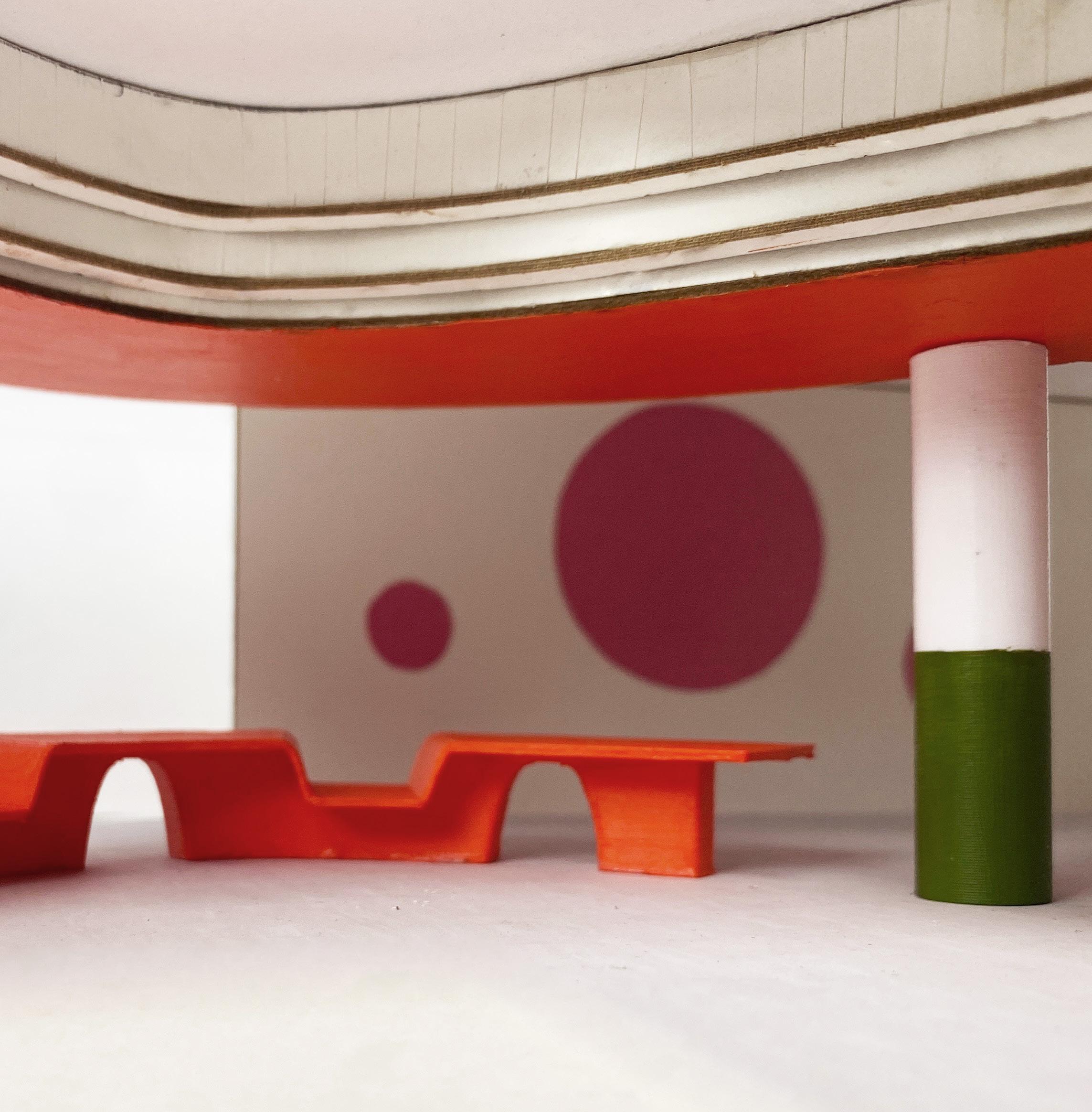 Incorporated into the design is multiple layers of repeating elements. These features were used in order to really push the idea of mass production.The tables are also conveyor belts of their own, drawing further from mass production factories. Irony plays out in this design as well because there is a use of fun, 1970s inspired colors throughout the space while also making the user think about the impact that this revolutionary idea has on the world.
