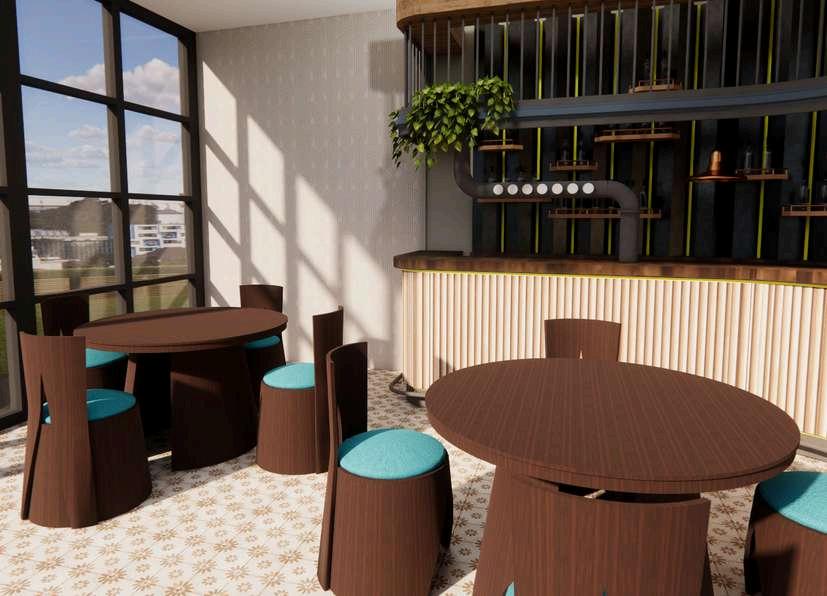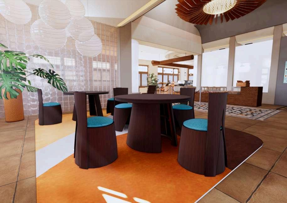 Thisareaisintentionallydesignedtoevokeasenseofhomeliness Itaimstodevelopafeelingoffamiliarityandcomfort forcustomers,ensuringtheyfeelsafe,comfortable,andrelaxed.Theincorporationofnumerousplants,woodmaterials, andcurvedelementsisessentialtoreflectthebrandidentityr