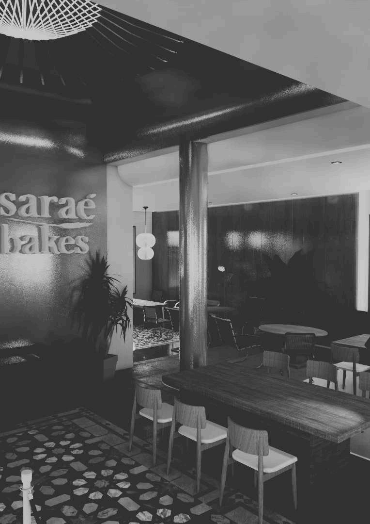 Due to Sarae Bakes' focus on healthy-based goods, I aim to present the store as a place that feels as comforting as home. Incorporatingelementsreminiscentofhome,suchasnumerous pendant lighting fixtures, dimmed lighting, and diverse flooring to delineate different areas The fusion of Japandi and Postmodern styles creates a relaxing ambiance rather than a formal dining atmosphere Various plants are used to reinforce the brand identity, while frosted glass panels provide a sense of naturallightandspaciousness.
