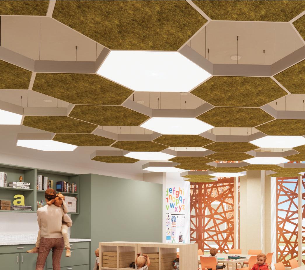 The warm material palette, with selective use of color, creates a welcoming environment. Playful use of lighting and sound absorbents create functional yet exciting spaces.