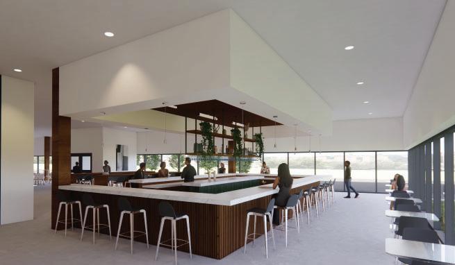 Facility operations, including a conference room and offices, are close to the lobby for easy access to visitors. A curved glass wall is a prominent feature of the restaurant, an amenity that will be used by residents and their visiting families.