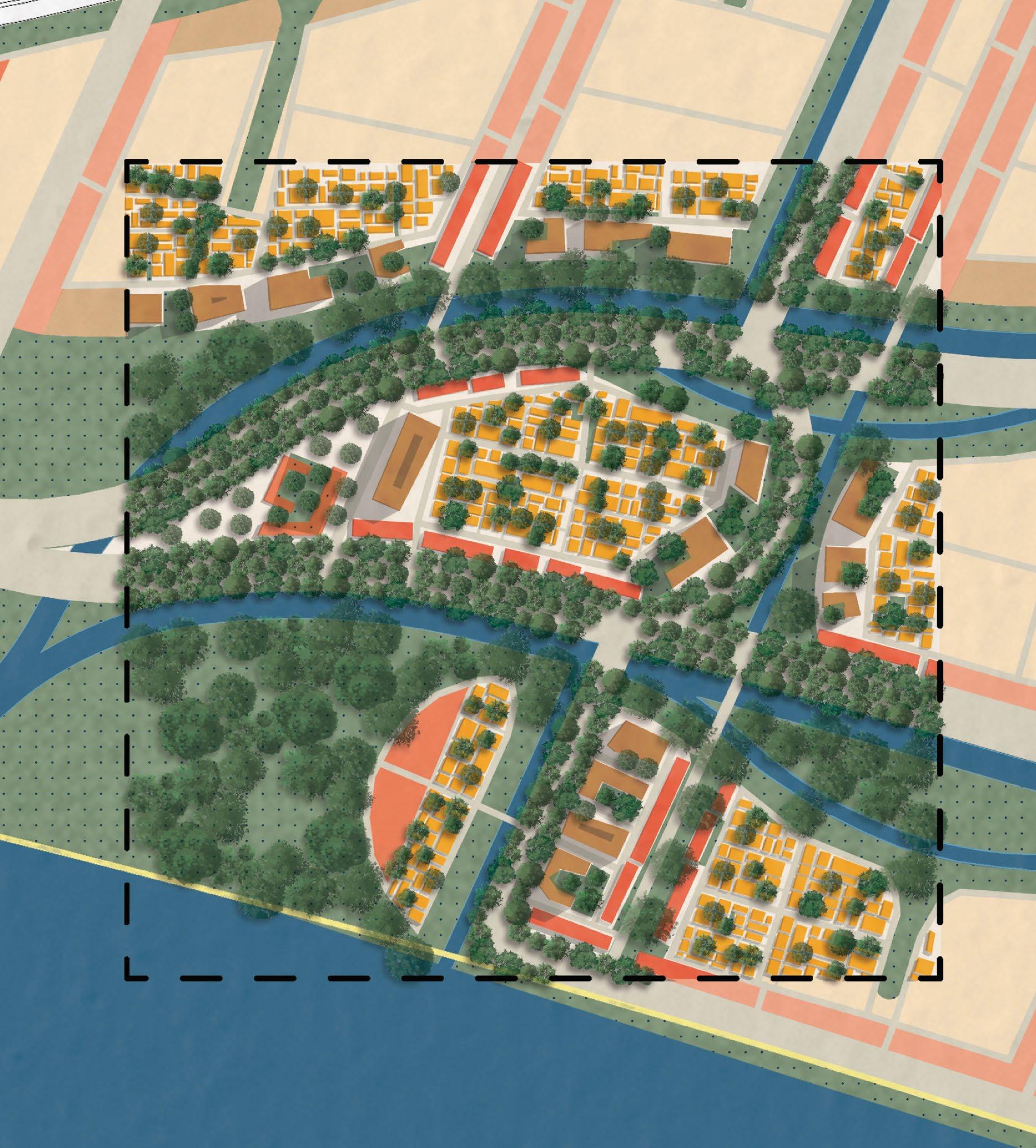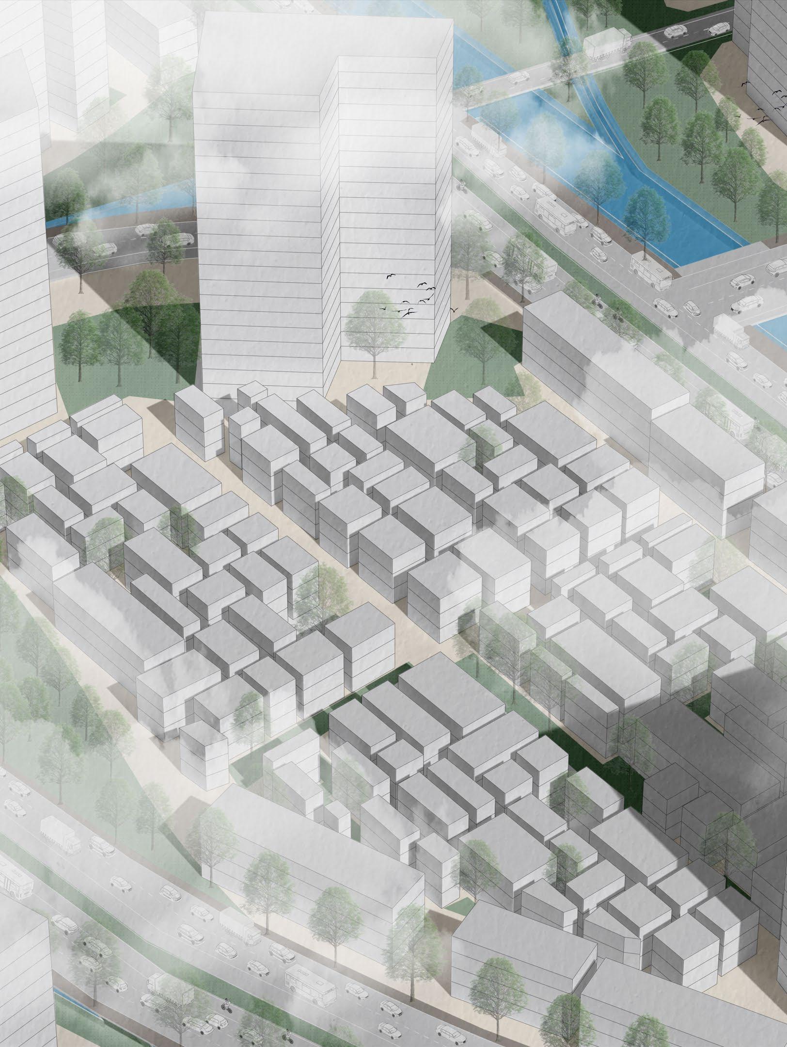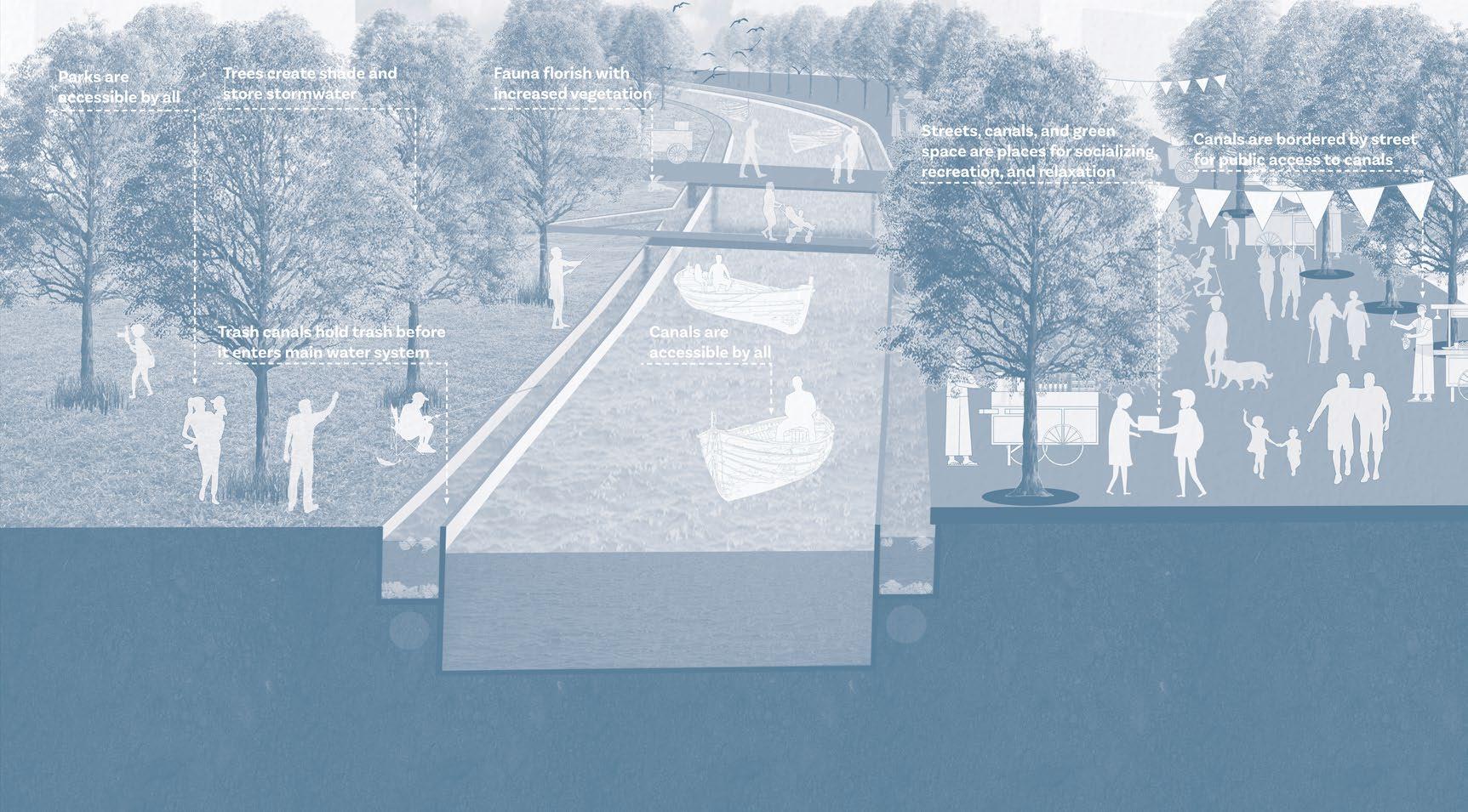 Green spaces, canals, and streets are the main public sphere where people can socialize, buy or sell goods, or relax. Additionally, the Biophilic City uses intersections between the green spaces, streets and canals as main programmatic spaces, as they can be accessible easily by car, boat, bike, or foot. This green network, streets, and canals are open and accessible by all in Khlong Toei. The canals are bordered on each side by green space or a street to force a no-building policy to keep the canals public to all residents.