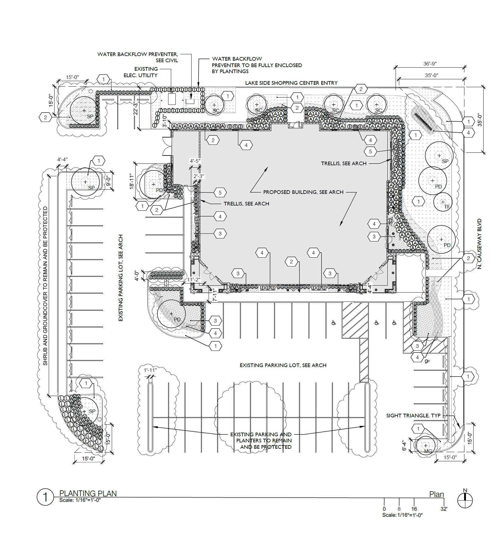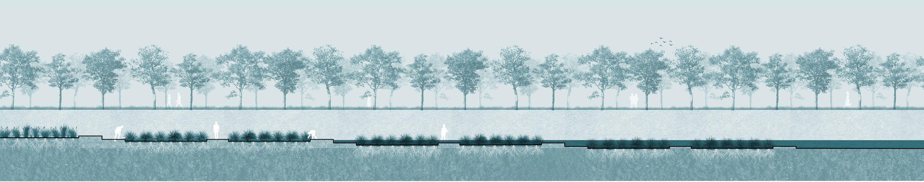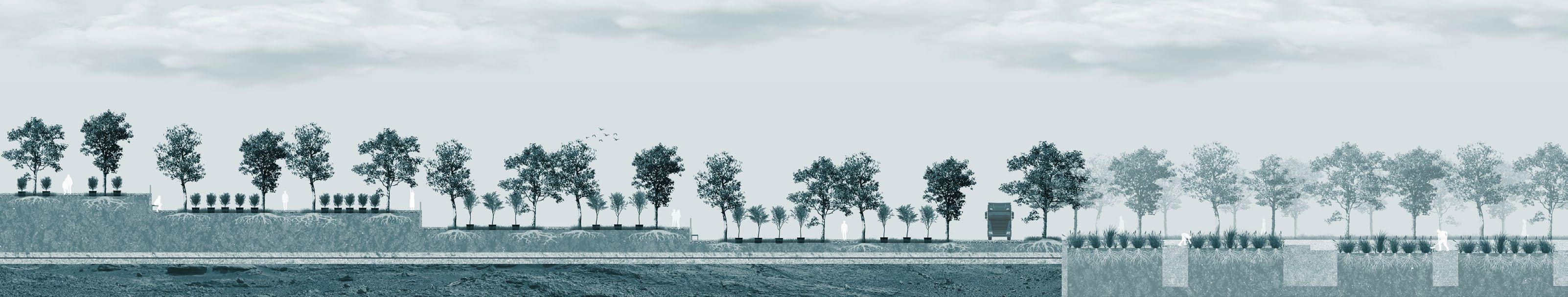 Upland plants, including salt-resistant trees and shrubs are positioned and organized on the top terraces above the existing Wheelabrator landfill.