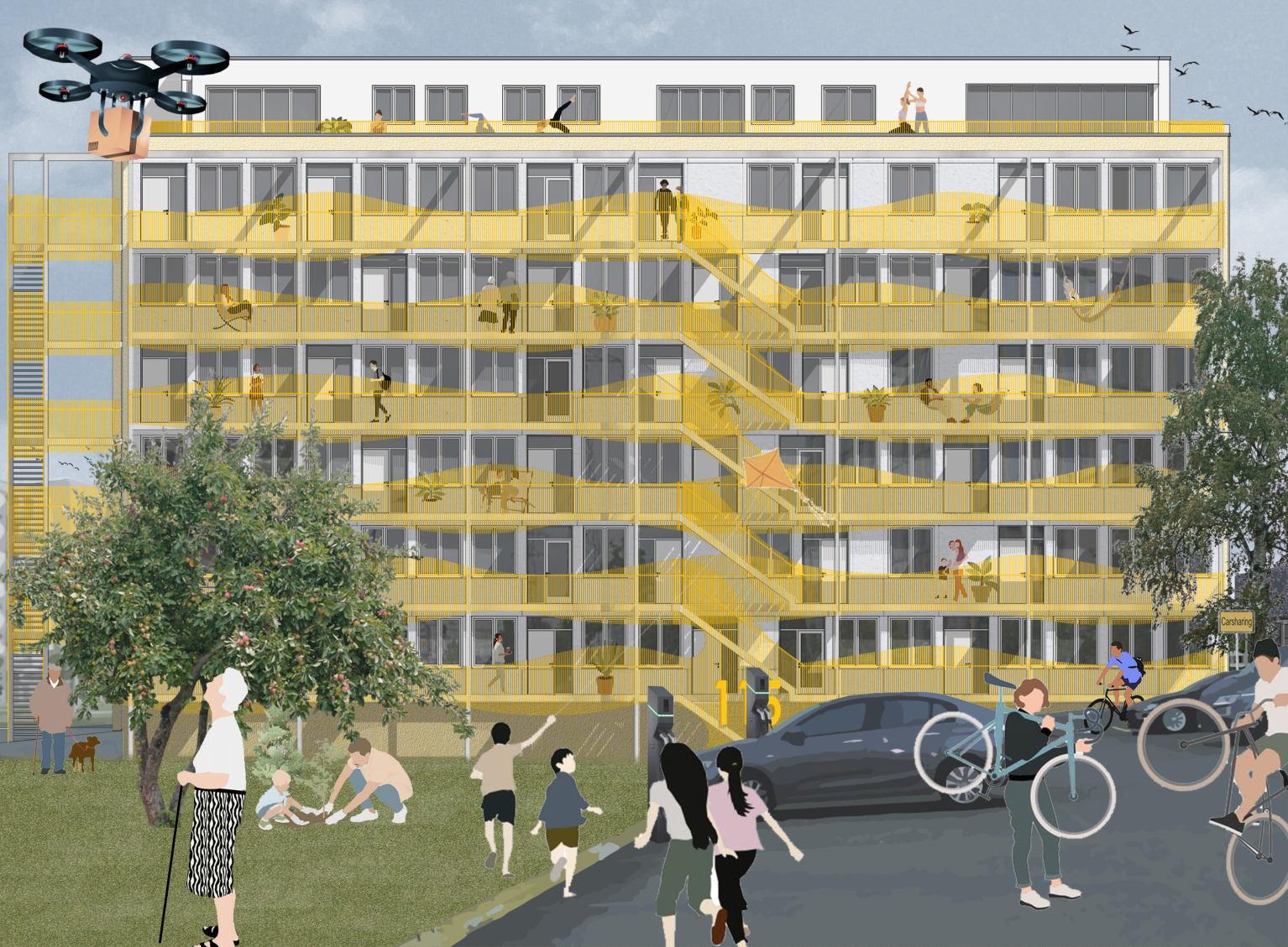 Der Entwurf beinhaltet Lösungsmöglichkeiten für die Umnutzung eines Bürogebäudes in Zürich zu Wohnraum mit einer langfristigen Nutzungsperspektive. Das innovative Konzept bietet Wohnraum für unterschiedliche Nutzergruppen und Wohnformen, wie etwa Familien, Singles, junge Menschen, ältere Menschen, getrenntlebende Paare, PatchworkFamilien oder Wohngemeinschaften allen Alters. Das Angebot umfasst mehr als nur Wohnraum. Es stellt einen Mikrokosmos bereit, zu dem auch Geschäfte, Büros, Coworking-Spaces und Gemeinschaftsräume gehören. Zusätzlich stellt das Angebot auch wünschenswerte Infrastruktur für das umliegende Quartier bereit. Das Gebäude bietet für unterschiedliche Lebensphasen/-situationen passende Räumlichkeiten dank flexibler Anpassung der räumlichen Strukturen. Ziel dieses Entwurfs ist es dank der einfachen Anpassbarkeit sein ganzes Leben im Gebäude verbringen zu können.