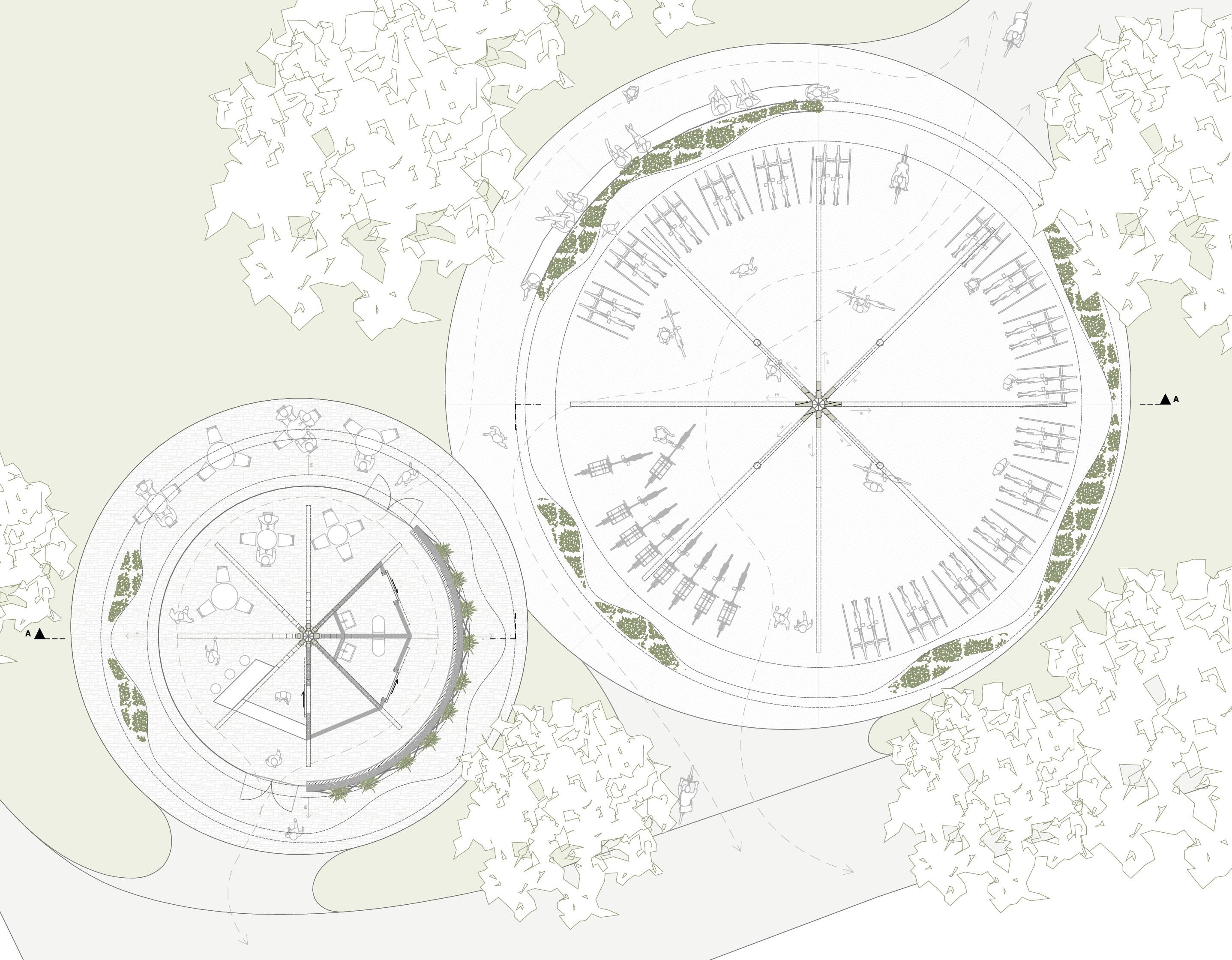 Der Entwurf besteht aus zwei kreisförmigen Gebäuden, die sich sowohl in ihrer Nutzung als auch im Volumen voneinander unterscheiden. Die runde Formgebung resultiert zum einem auf kreisförmige Raum- und Gebäudeelemente, die sich in unmittelbarer Nähe des Grundstücks befinden. Des Weiteren soll aufgrund der Platzsituation keine Ansichtsseite einen Rücken zu Passanten ausbilden, sodass die Gebäude aufgrund der kreisrunden Form von jeder Blickrichtung aus eine gleichwertige Ansicht generieren und zusätzlich eine harmonische Durchwegung durch das Gelände ermöglichen.