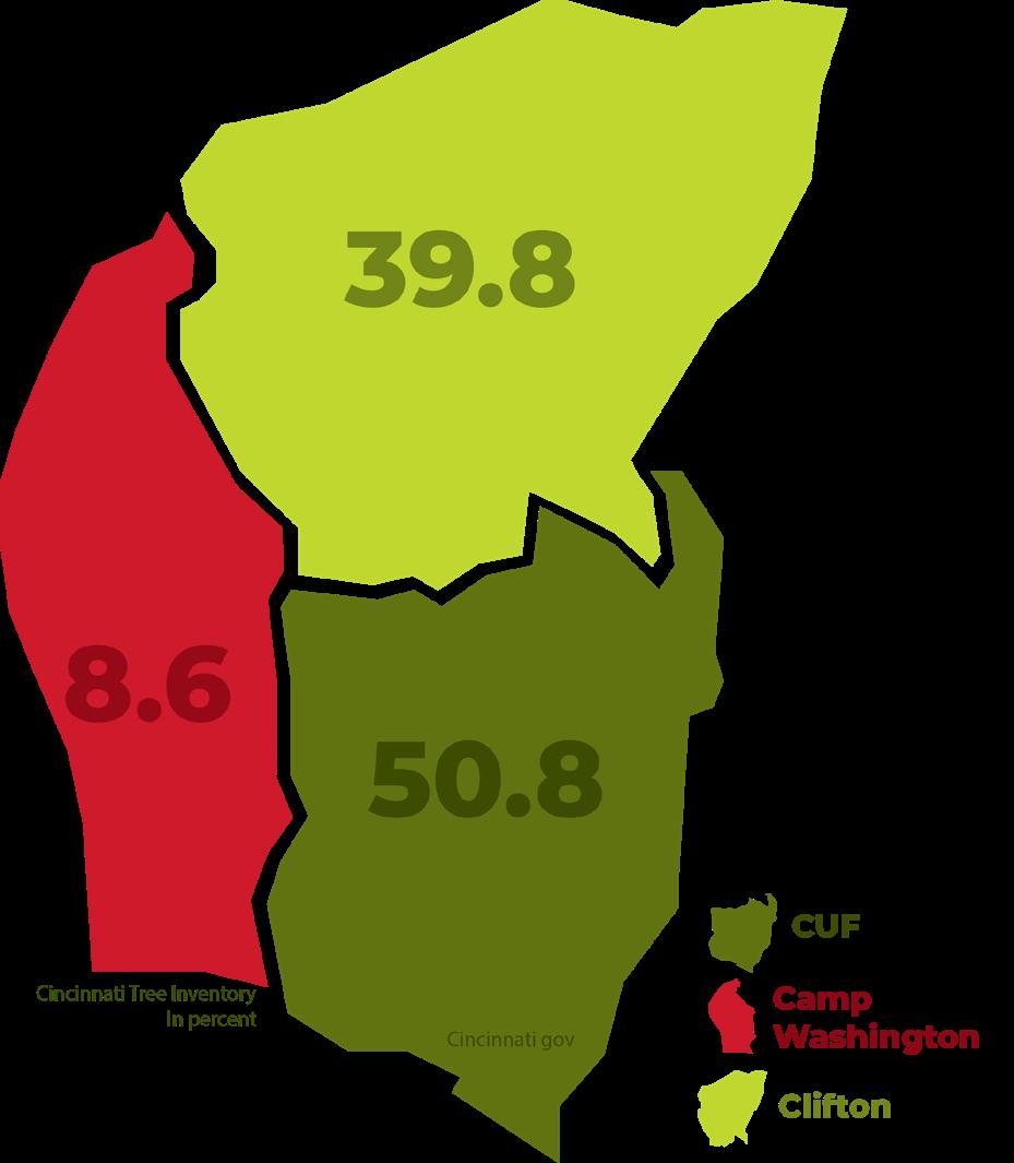 Camp Washington lacks tree canopy, ranking very low among the neighborhoods in Cincinnati for tree canopies.