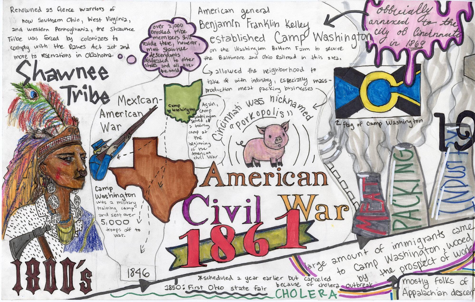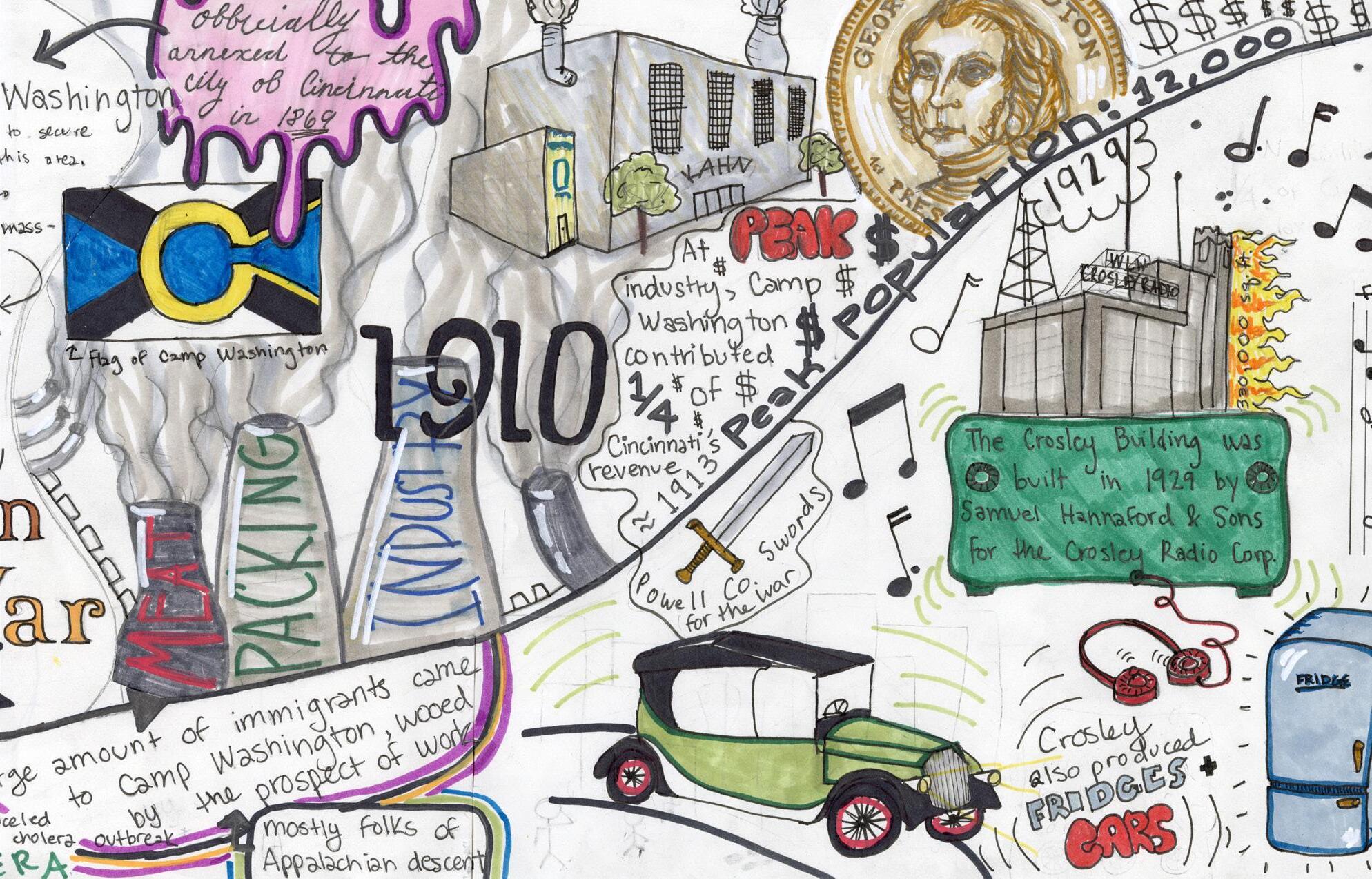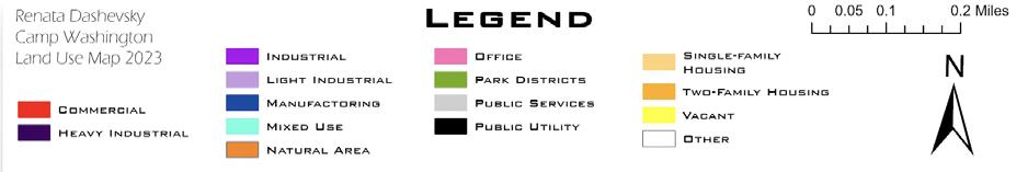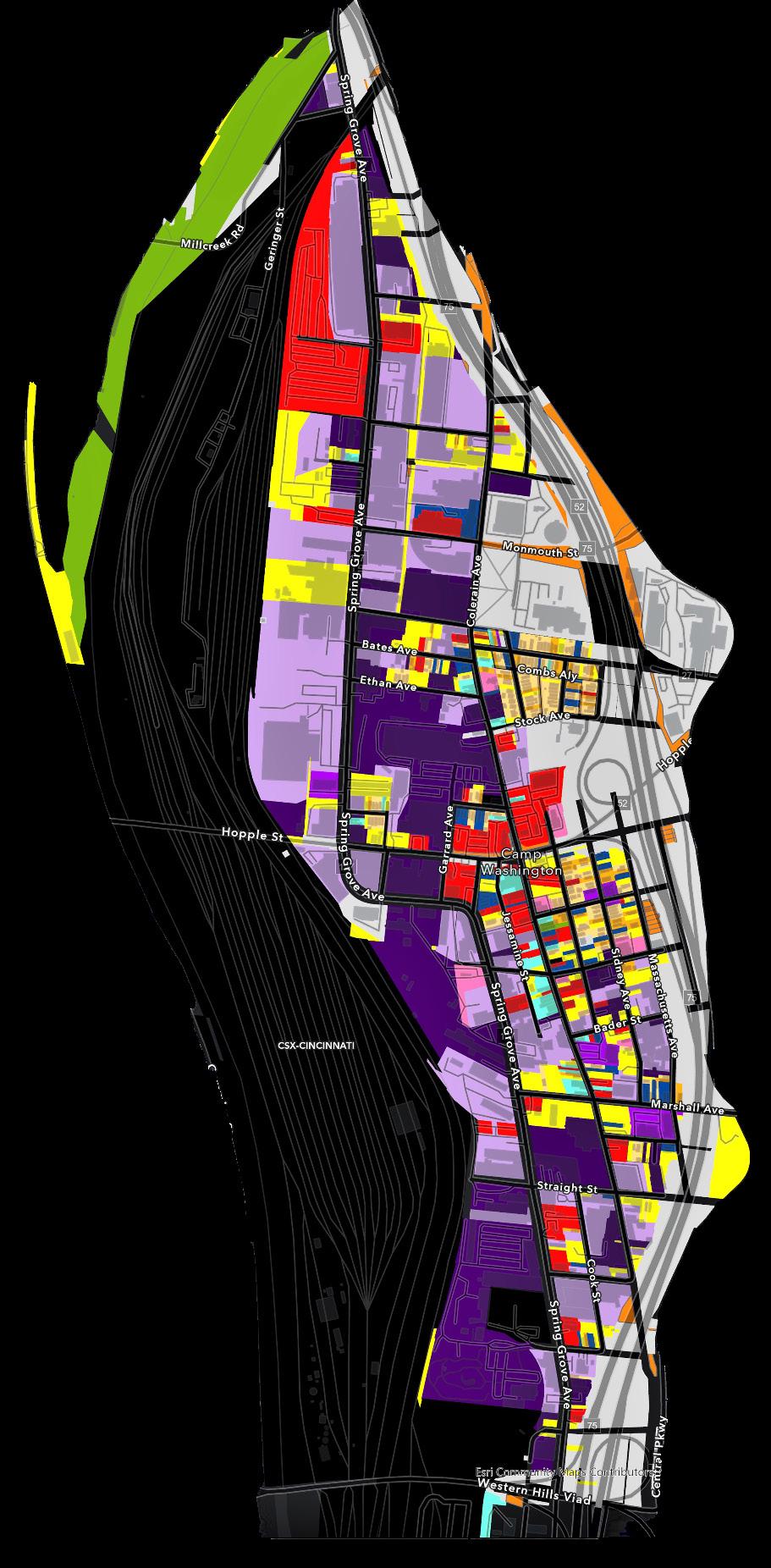Camp Washington is a neighborhood that peaked during the Industrial age, leading it to become an overly-paved and non-walkable neighborhood. The demographic makeup originally consisted of Appalachian roots, Camp Washington also has unique employment patterns, green space makeup, and population density.
