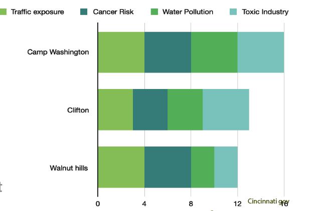 Camp washington compared to other neighborhoods ranks higher on all pollutants than surrounding uptown neighborhoods.