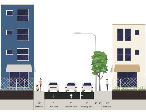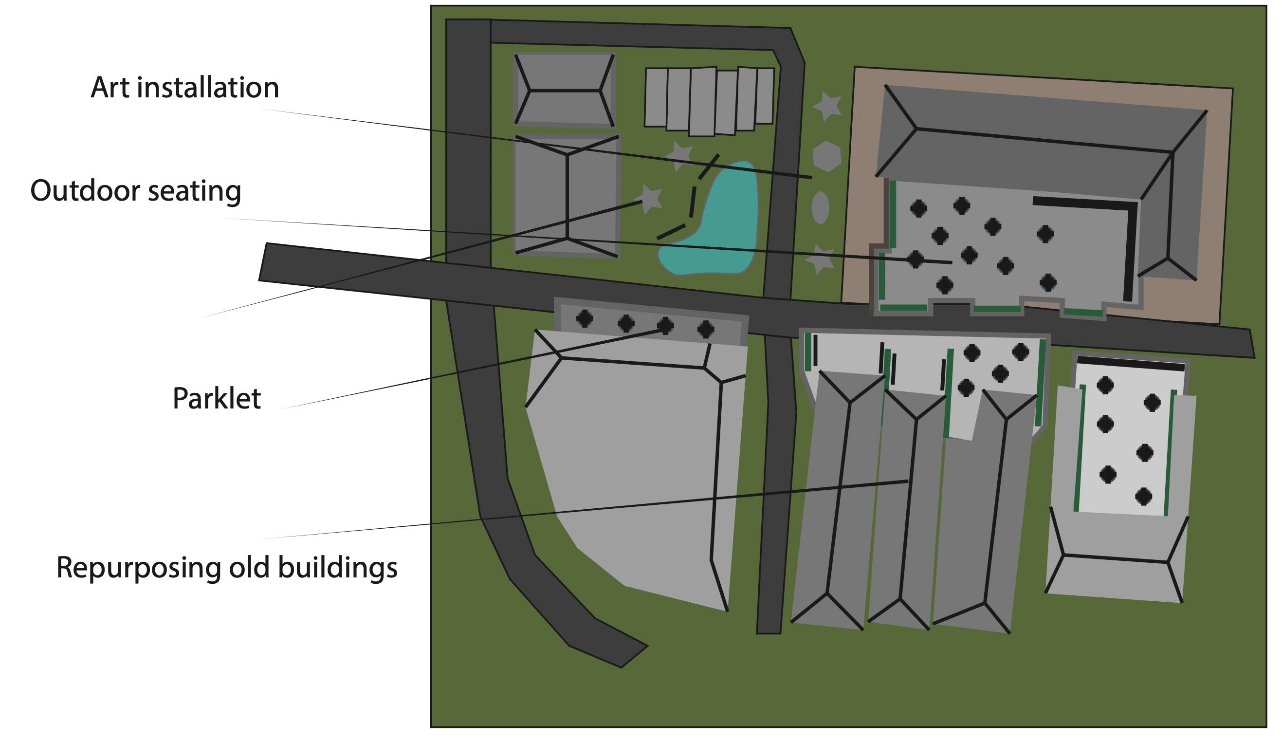 This area has the potential to become a hip artistic hangout, helping to identify more of a identity for the neighborhood. Two lanes will be taken out of Hopple to introduce parklets to the area. These will encourage visitors to sit and stay for a while, enjoying the central business district.