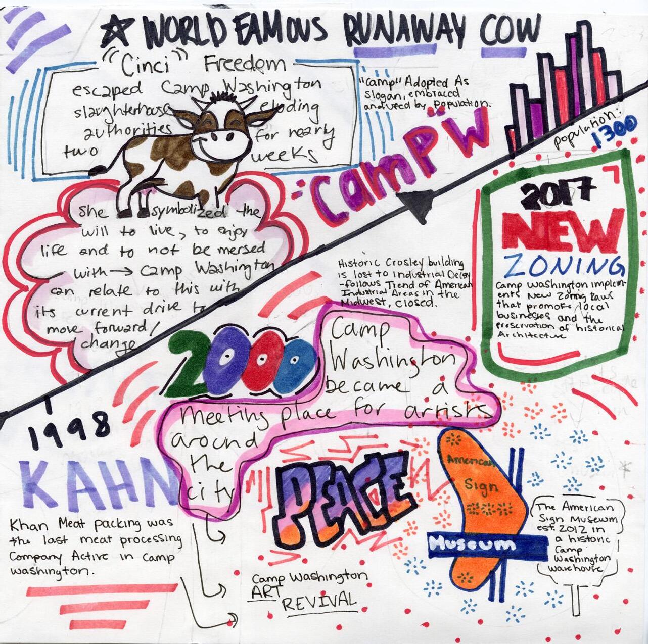 Camp Washington now is slowly rebranding to an artistic community. Following the lead of Cincinnati as a whole. The area also hosts the American sign museum which has recently moved into Camp Washington. The congregation of these artistic institutions has a snowball effect, attracting more artists, more murals and more galleries.