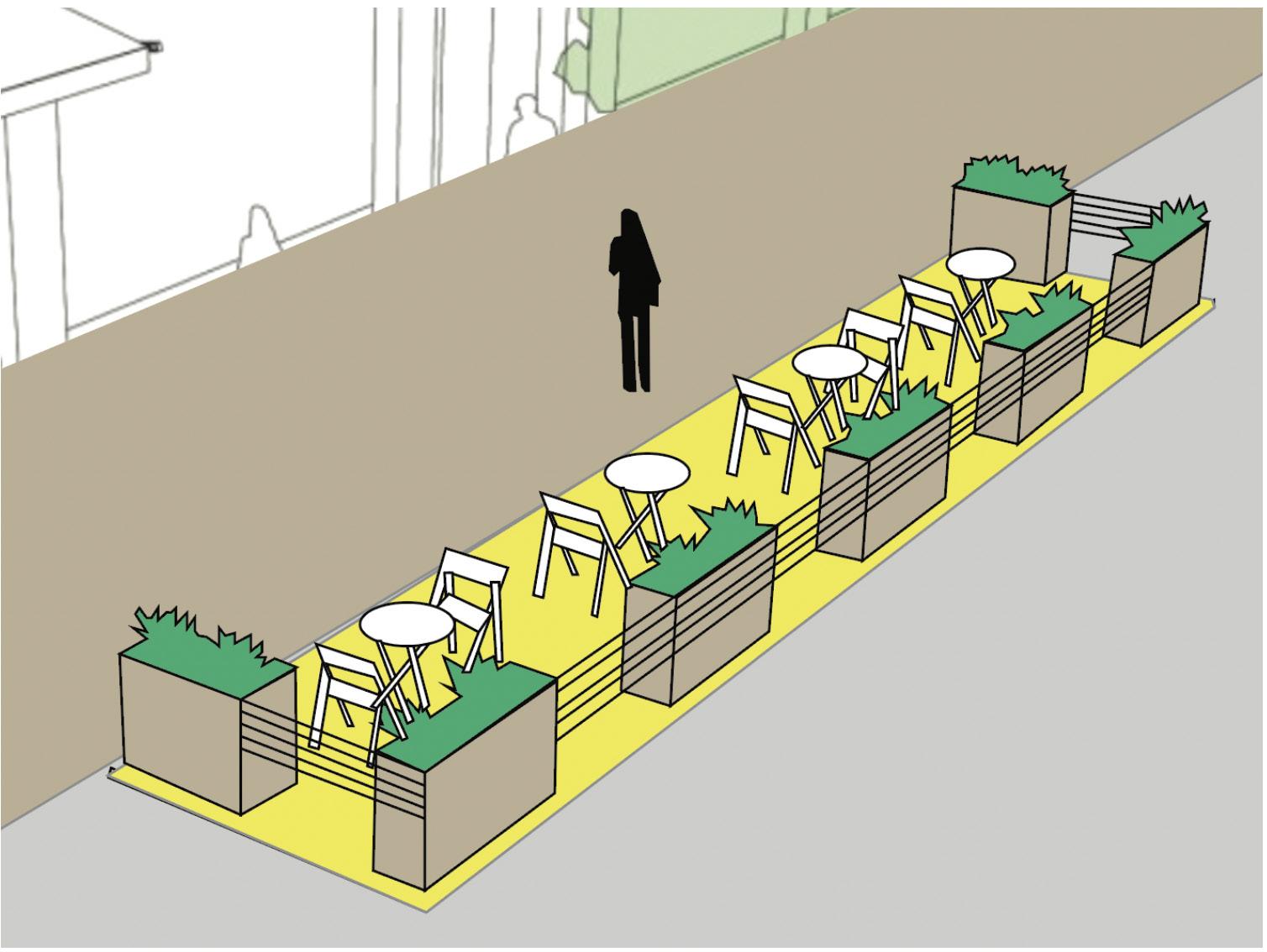 When the weather is warm and dry, seating will be open and uncovered. String lights will brighten the space and create ambiance. A tall green barrier creates