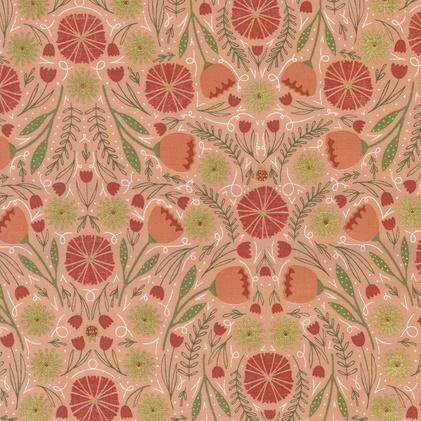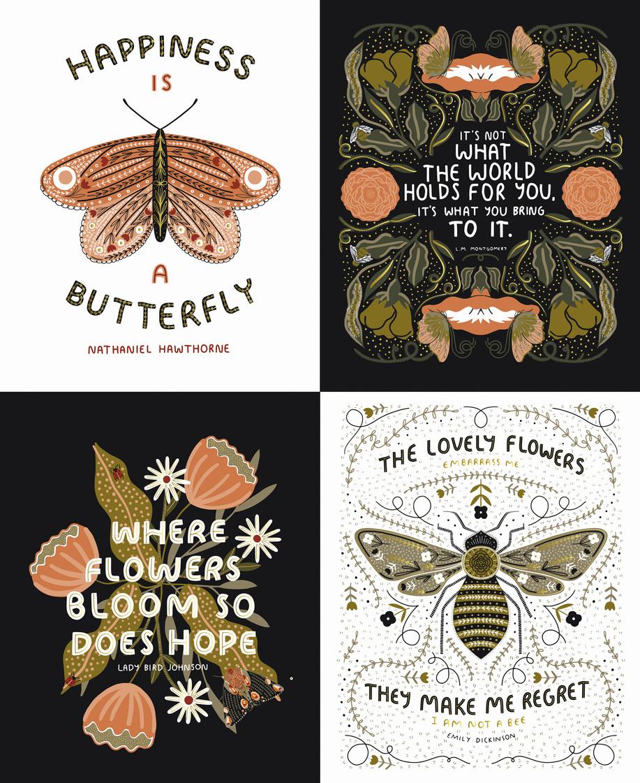 Let's go for a walk through the meadow together You might see a grasshopper jumping from blade to blade. You might notice some mushrooms sprouting under an old willow tree. Look! A butterfly resting its wings. Welcome to Meadowmere. This fabric collection is a magical mix of flowers, winged creatures, and the essence of a meadow full of new life. With metallic gold details, my favorite floral illustrations, and my more special panel illustrations featuring quotes from my favorite poets and authors, this thoughtful followup to "Dwell in Possibility" will inspire you to walk outside, close your eyes, take a deep breath, and appreciate the pure imagination and exhilaration of this magnificent world we live in.