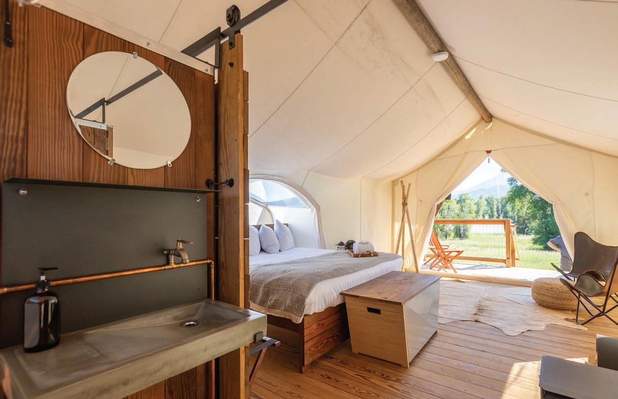 An in-camp concierge operates out of the lobby tent and can share insider tips on favorite under-the-radar hikes and craft bespoke guided outdoor experiences, from fly fishing to rock climbing. At North Yellowstone, we floated down the river, noshing on charcuterie and sipping chardonnay in the hull of a handsome wood McKenzie-style drift boat hand-built by Jason Cajune. The lifelong outdoorsman, hunter, and adventurer learned his craft from his father, who grew up on the Flathead Reservation. The waitlist for those wanting to get their hands on one of his boats can span as much as six years. Rather than ramp up production, Cajune prefers to go at his own pace and enjoys operating the guiding side of his