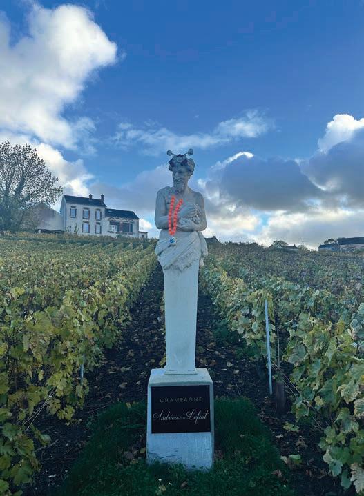 A statue of Bacchus watches over a vineyard in Champillon.