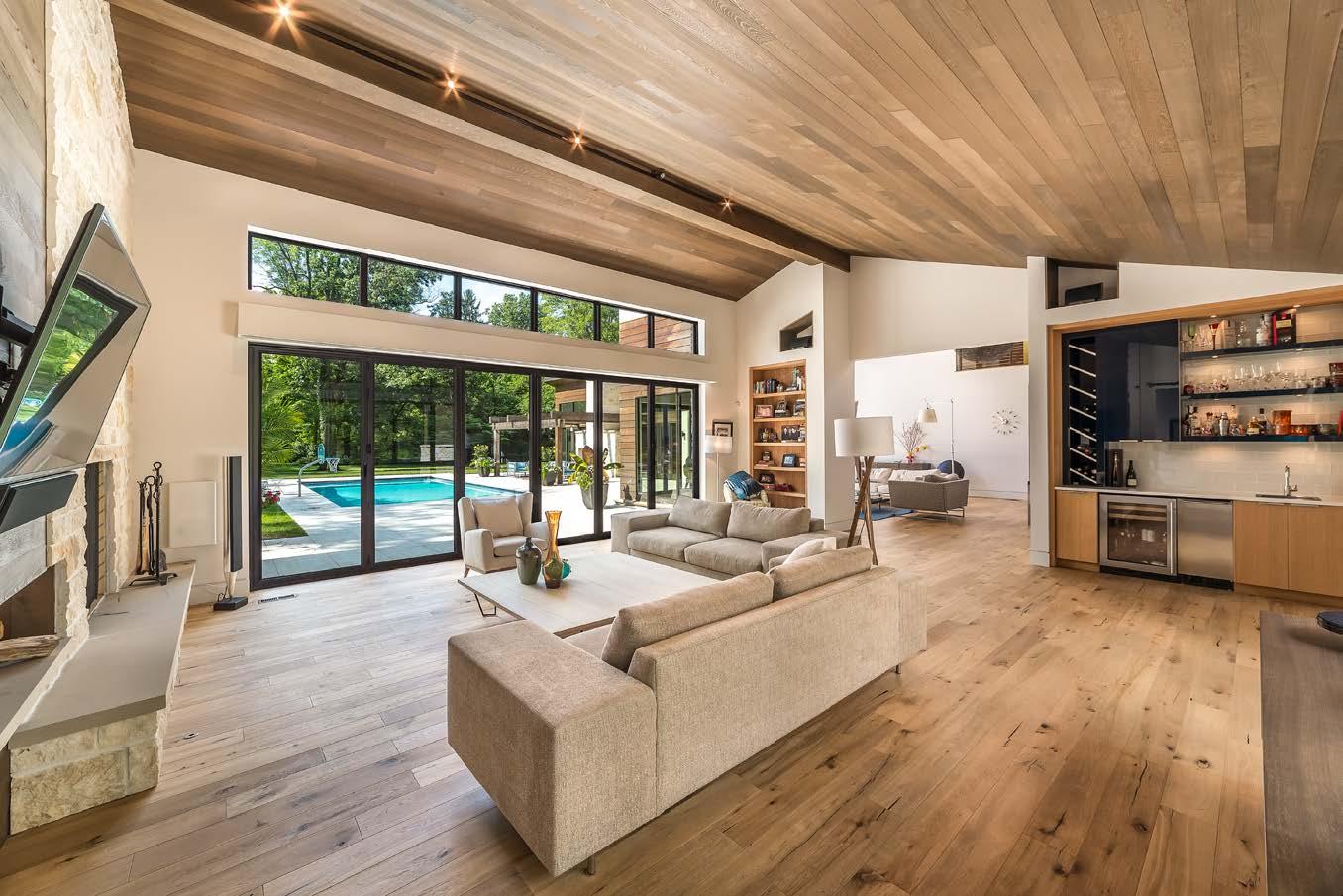 Oversized sliding glass doors in the kitchen open fully to reveal a covered patio and state-of-the-art pool. “Tresss Aquatectural Designs installed this pool that is specifically designed to fit tight spaces,” says Joe. “It’s like having an invisible water feature under your patio.” This innovative system transforms the patio into a pool with the touch of a button by lowering the grade level surface to the bottom of the pool, with the ability to create a customized swim experience