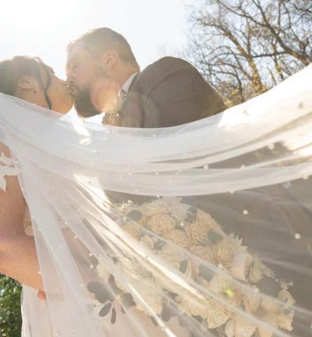 Alexandra Weldy, of Elkhart, and Tyler Baker, of Indianapolis, were married on October 27, 2024, at the Conservatory at Evergreen, in Indianapolis. Their parents are Tina and Cwyn Weldy and Tammie and Steve Baker. Tyler proposed to Alexandra on the top of Mendenhall Glacier in Juno, Alaska, where her family was celebrating her grandparents’ 60th anniversary. The couple designed their rose gold rings with the help of designers at Reis-Nichols, incorporating Tyler’s birthstone, sapphire. Their wedding ceremony included several nods to the couple‘s interest in Viking culture, including white daggers with flowers carried by the bridesmaids and leather-bound hatchets carried by the men. In what is known as a ring-warming ceremony, their rings were passed among family members for a blessing. The couple reside in Indianapolis, where Tyler is an executive barber at Red’s Classic Barbershop and Tyler Mason Salon Spa, and Alexandra is a graphic designer with Image Bloom. sl