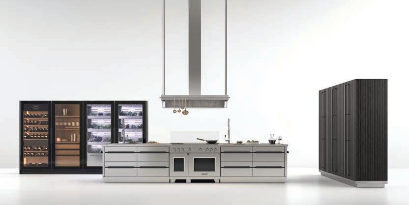 This page: Bloom 3 pendant handmade by Studio Umut Yamac in London (umutyamac.com). Random Clouds by Chia-Ling Yee for Lodes is available in seven color schemes and can be configured into clusters of 7, 14, 19, or 23 lights (lodes.com). Ginger & Jagger Geode console (gingerandjagger. com). Barnaba Fornasetti with Poltrona Frau’s Vanity Fair XC armchair reinterpreted by Fornasetti with the design silk screened onto leather. Limited edition of 50 pieces (poltronafrau.com/us/en). Llama bar cabinet from Kenneth Cobonpue features two compartments that opens on each side, built-in wine glass holders abd finely sanded wooden table top (kennethcobonpue.com). BELLY liquor cabinet by Studio Roderick Vos available in red, yellow & blue (roderickvos.nl). Etro Home Interiors Quiltana armchair with floral Gobelin fabric, selected from the Etro archives (etro.com). Gianfranco Ferré Home Brygge chair (gianfrancoferrehome.com). Omoi armchair from B&B Itali (bebitalia.com) Opposite page, clockwise from top left: LIBRA vase from Studio Umut Yamac (umutyamac.com). Moooi 500 Tube Light by BCXSY & Carbon bar stool (moooi.com). Minotti Vivienne armchair (minotti.com). Rimadesio Rialto bar cabinet in Taiga ebony-stained wood on the exterior and natural wood interior. Photo by Josh Wong (rimadesio.it/en/). Ceramica Cielo Itaca basins in Talpa finish (ceramicacielo.us/ en). La Michetta modular sofa blocks from Meritalia (meritalia.it/en/). FAS Pendezza ping pong table made entirely of glass available in white, black or transparent. Eliminating the game net allows it to be used as a sleek dining or meeting table (faspendezza.net). Aurena ceramic vanity designed by Antonio Citterio for Duravit with integrated dividers (duravit.com). Arclinea Proxima kitchen, designed by Antonio Citterio. Shown with Hortus, a piece of furniture characterized by the double large coplanar doors and designed for growing aromatic herbs and small vegetables. Hortus represents the integration in the Arclinea design of the domestic version of a hydroponic cultivation controlled by a software, Studio Pepe Visionnaire capsule collection (studiopepe.info) which offers the possibility of always having fresh and organic products for the table (arclinea.com/en/journal/proxima.html).